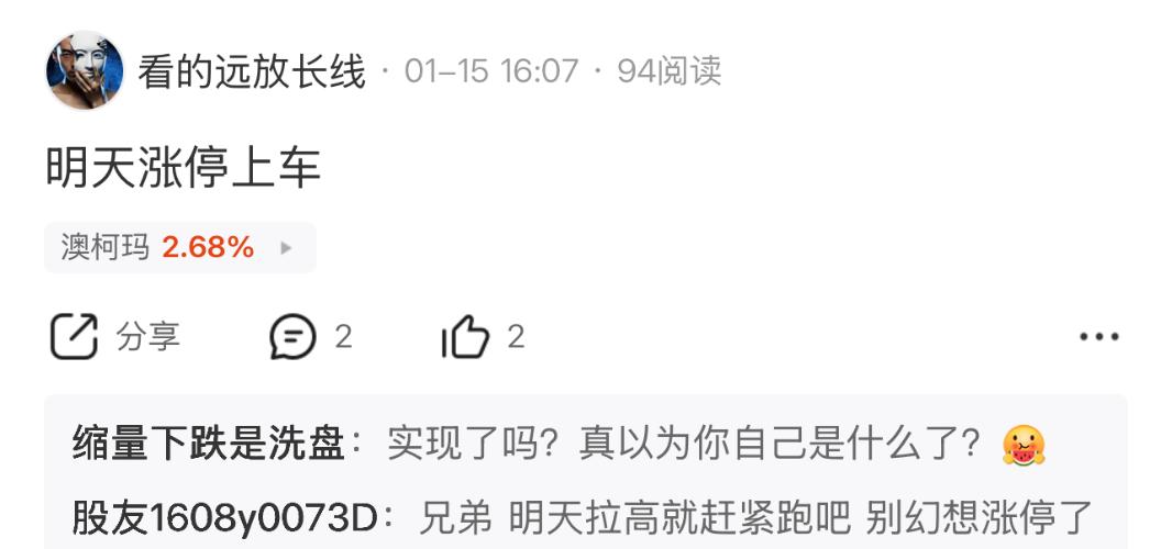 温馨提示: 1.根据《证券法》规定,禁止编造、传播虚假信息或者误导性信息,扰乱证券市场;2.用户在本社区发表的所有资料、言论等仅代表个人观点,与本网站立场无关,不对您构成任何投资建议。用户应基于自己的独立判断,自行决定证券投资并承担相应风险。《东方财富社区管理规定》
