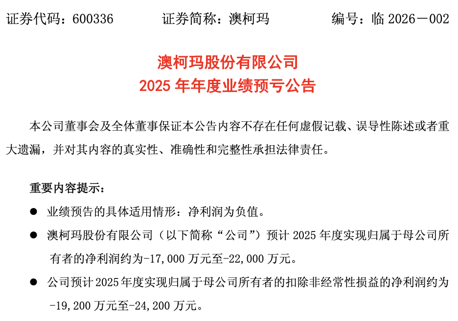 1月25日,澳柯玛(600336)公告称,经财务部门初步测算,预计公司2025年度实现归属于母公司所有者的净利润约为-17,000万元至-22,000万元,与上年同期相比,亏损将大幅增加。预计2025年度实现归属于母公司所有者的扣除非经常性损益的净利润约为-19,200万元至-24,200万元。