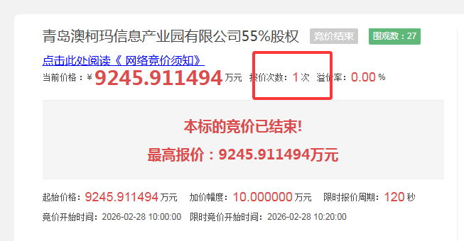 青岛澳柯玛信息产业园有限公司55%股权转让成功