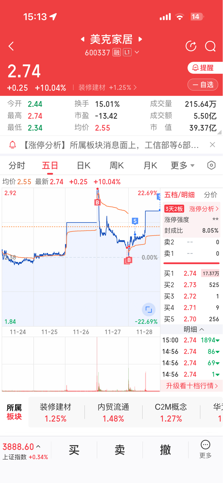$美克家居(SH600337)$ 虽然我昨天早上打板被套,一下子亏我15个点,我低位补了6倍的仓,现在倒赚,哈哈哈,只出了一半的仓位,还有一半陪你玩