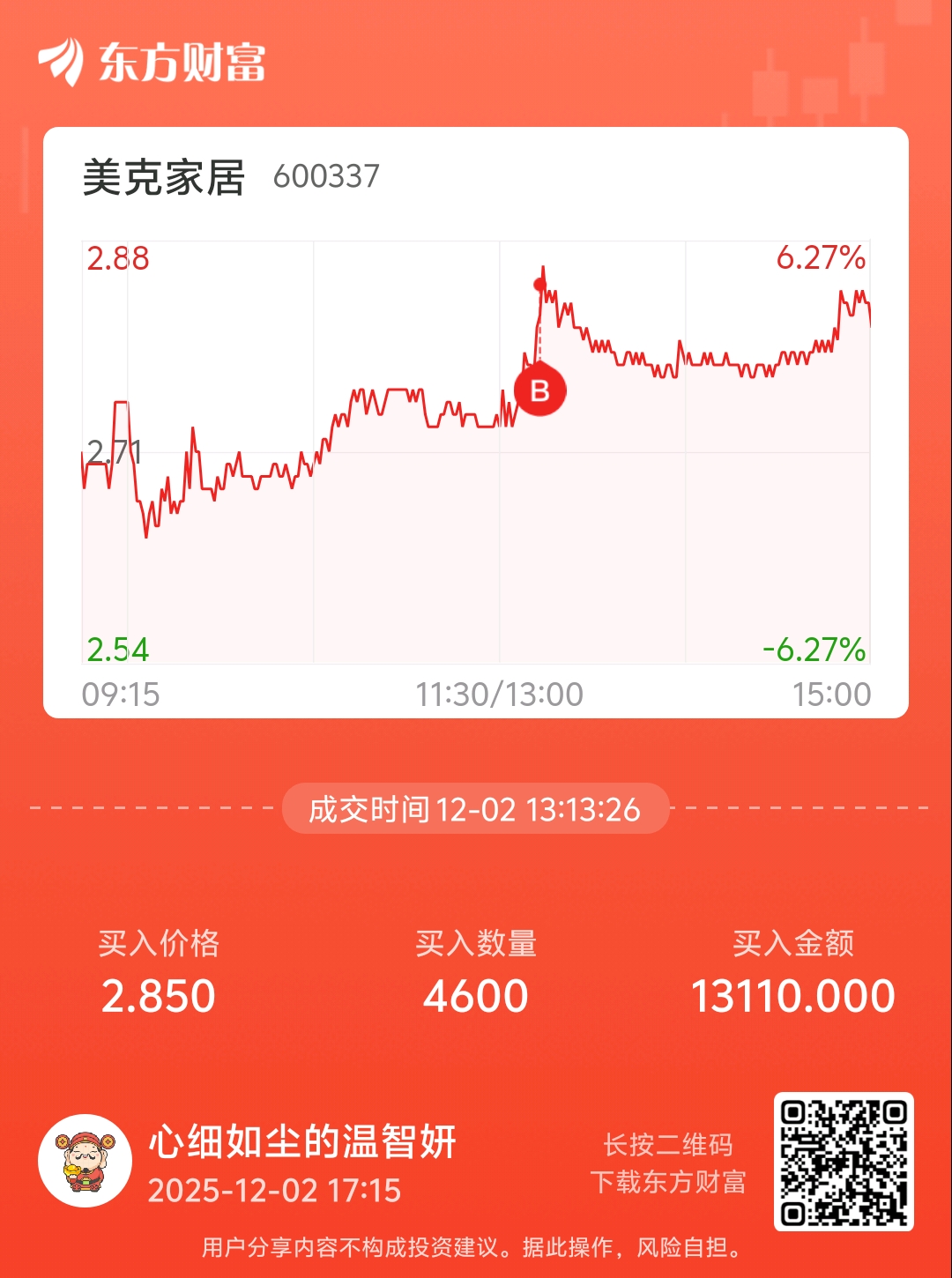 温馨提示: 1.根据《证券法》规定,禁止编造、传播虚假信息或者误导性信息,扰乱证券市场;2.用户在本社区发表的所有资料、言论等仅代表个人观点,与本网站立场无关,不对您构成任何投资建议。用户应基于自己的独立判断,自行决定证券投资并承担相应风险。《东方财富社区管理规定》