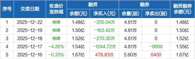 融资方面,当日融资买入0元,融资偿还205.04万元,融资净偿还205.04万元,连续4日净偿还累计1883.53万元。融券方面,融券卖出0股,融券偿还0股,融券余量4.61万股,融券余额13.46万元。融资融券余额合计1.48亿元。