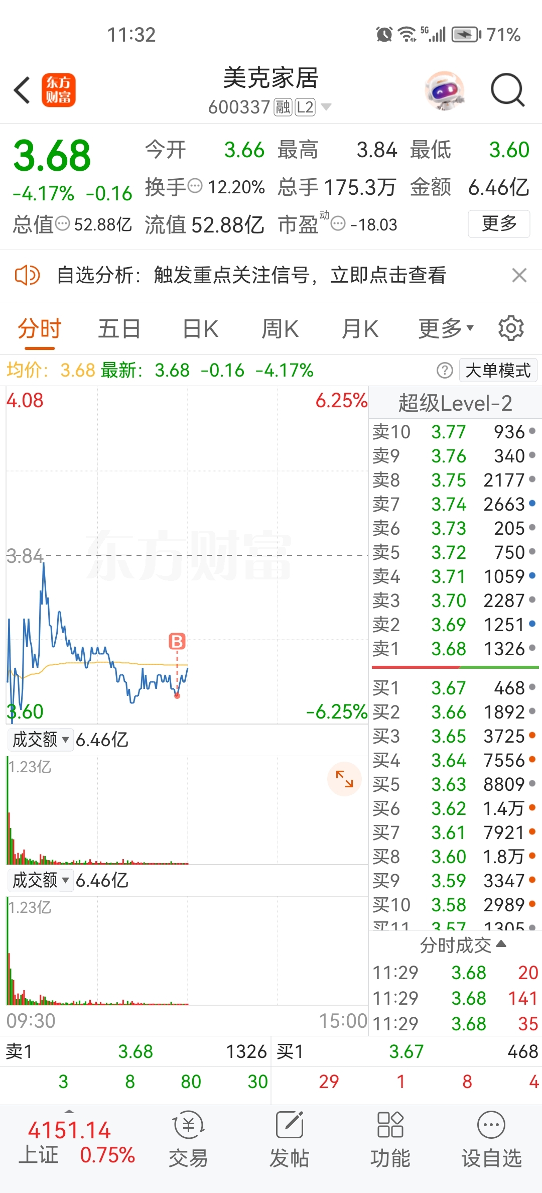 $美克家居(SH600337)$ 拉萨帮们,我来陪你们一起接盘啦,买的不多就15000多,看下午是跌停亏一条软中,还是涨停赚两条大金叶