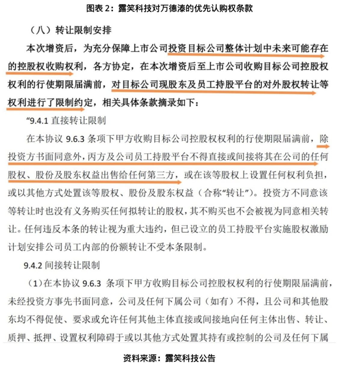 然而,短短7个月后,剧情骤然反转。在美克家居抛出并购万德溙100%股权的重组方案前夕,露笑科技却选择提前彻底离场——不仅主动放弃了此前锁定的股份优先认购权,更将所持全部股权交由万德溙实控人李少锋回购。据天眼查信息,2026年1月5日,万德溙完成股东信息变更,露笑科技正式从股东名单中消失,且其股权并未直接转售给收购方美克家居兑现退出收益,而是由万德溙实控人全额回购承接,至于回购具体金额、是否存在溢价,至今暂未对外披露。从积极“输血”的战略投资者,陡然变为决绝抽身的“逃离者”,露笑科技对万德溙这一态度的骤然反转,引发市场各界诸多猜测。