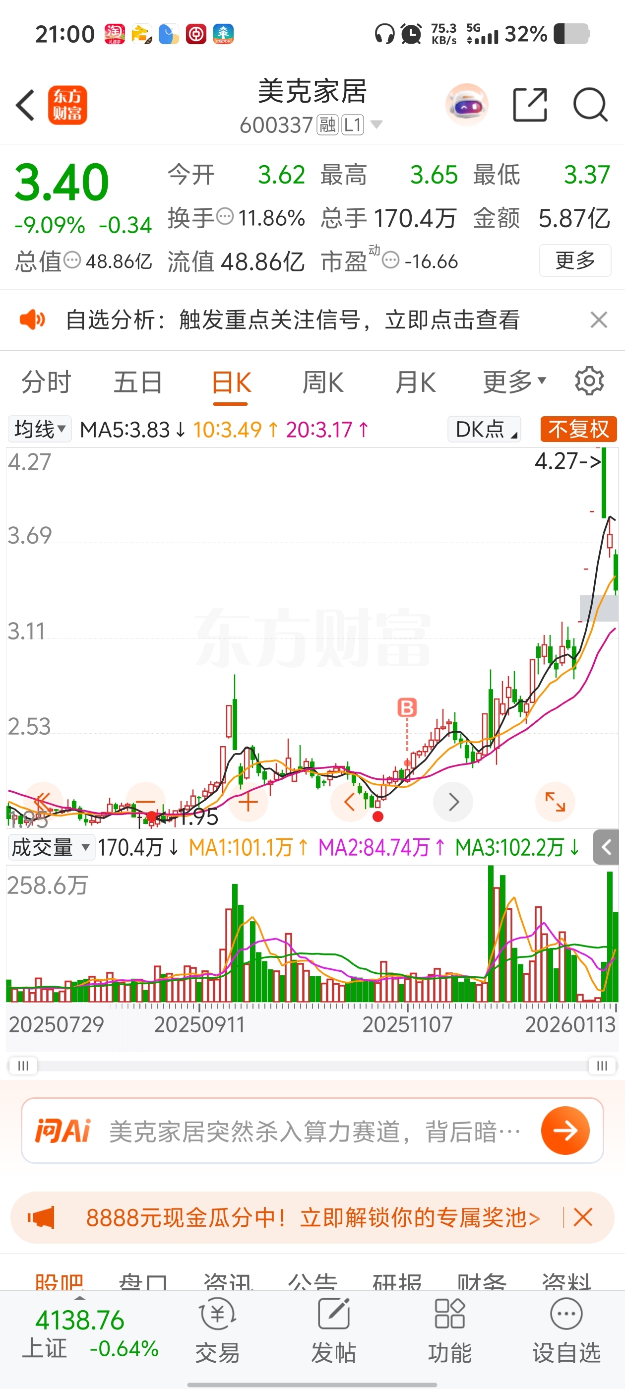$美克家居(SH600337)$ 我不卖就得跌回来