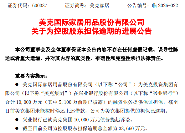 3月6日晚间,美克家居(SH600337)发布公告,披露为控股股东美克投资集团有限公司(以下称“美克集团”)担保逾期的最新进展。根据公告,美克家居为美克集团在兴业银行合计1亿元融资业务提供保证担保,其中5100万元前期已披露,截至目前美克集团未能按时偿还上述借款,公司为美克集团提供的担保已逾期。兴业银行已将剩余4900万元做提前到期处理,并就全部1亿元债务提起诉讼,要求美克家居履行担保责任。