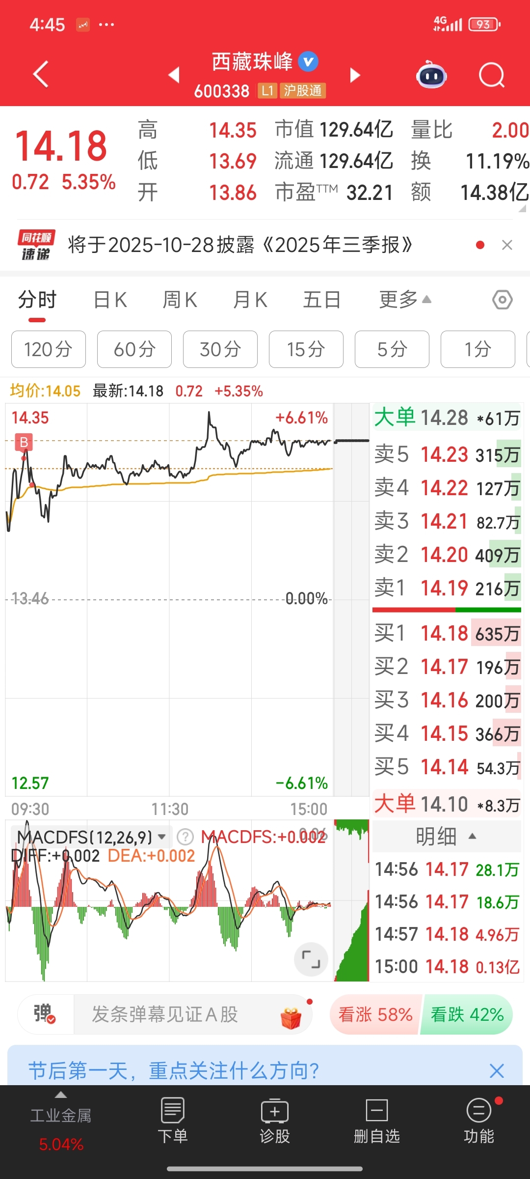 $西藏珠峰(SH600338)$ 今天有点追高了,先入手一部分仓位,等阴线再追加