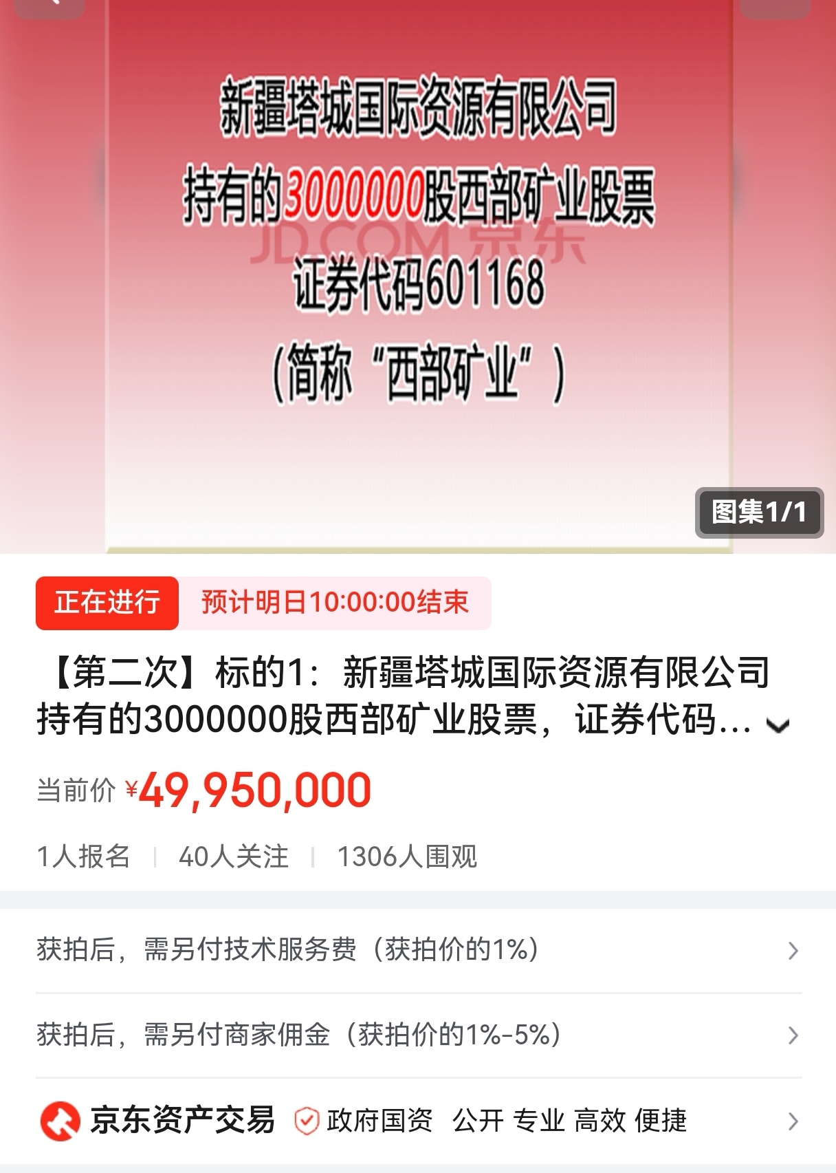 $西藏珠峰(SH600338)$ 塔城国际持有西部矿业股票 被拍卖了