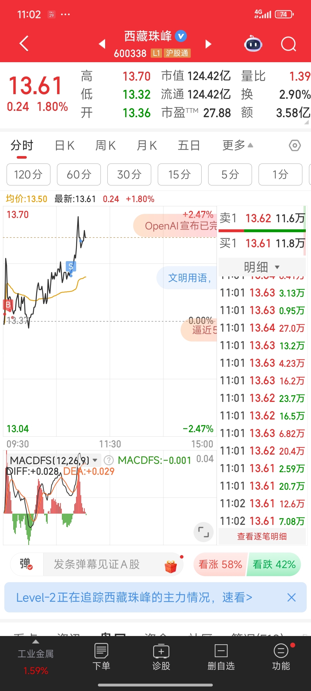 $西藏珠峰(SH600338)$ 这票不紧不慢的,适合做T, 跌了买点,涨了卖点。