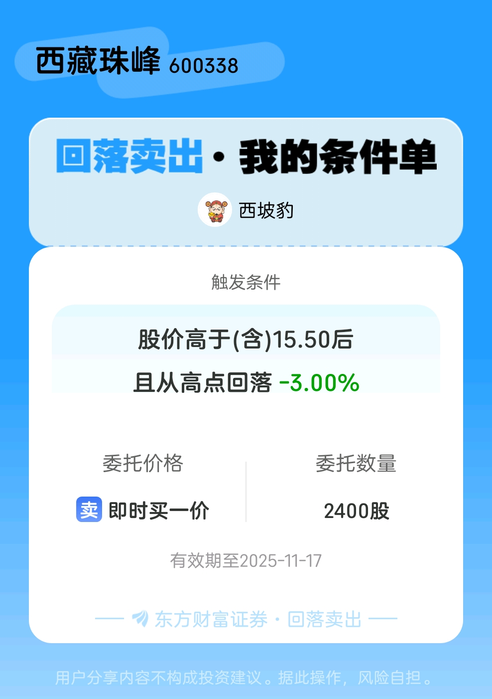 #条件单交流# #回落卖出晒单# 一位股神设置了一个回落卖出条件单,接下来就是见证奇迹的时刻~$西藏珠峰(SH600338)$