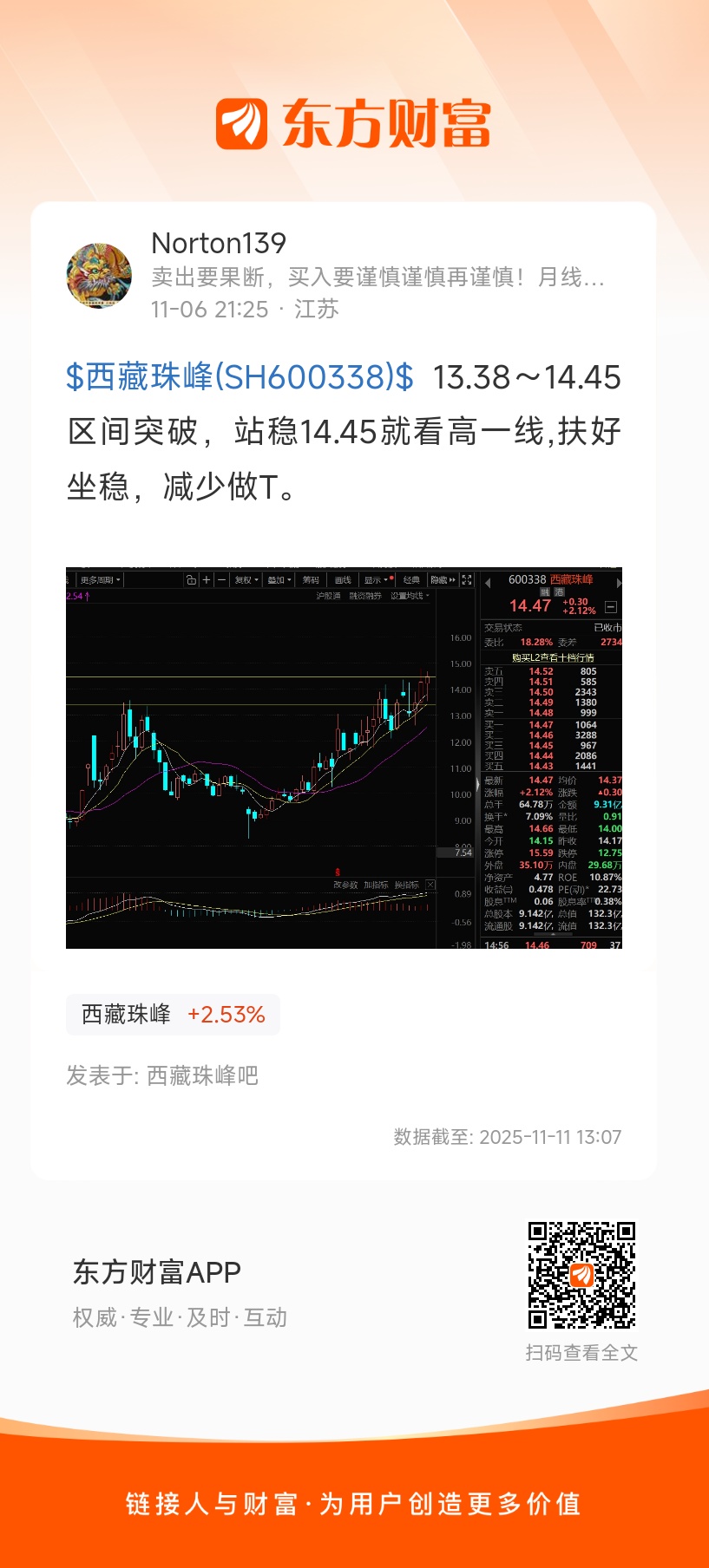$西藏珠峰(SH600338)$  13.38~14.45区间突破,站稳14.45就看高一线,扶好坐稳,减少做T。