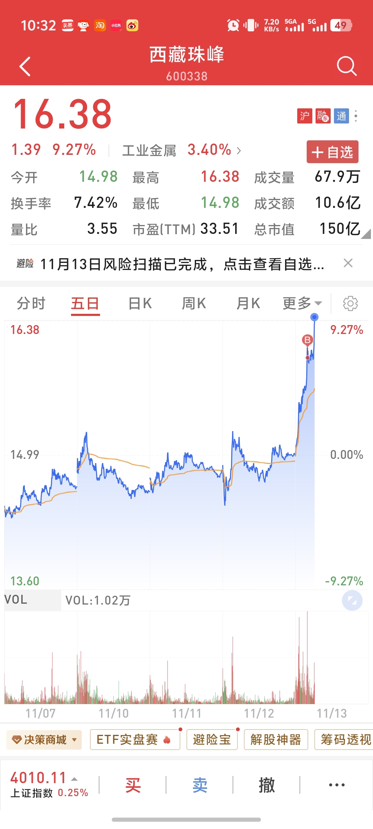 $西藏珠峰(SH600338)$ 能涨停吃个肉吗?成本比较高