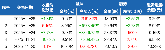融资方面,当日融资买入1.01亿元,融资偿还7988.36万元,融资净买入2119.32万元。融券方面,融券卖出700股,融券偿还2.62万股,融券余量18.09万股,融券余额258.14万元。融资融券余额合计9.2亿元。
