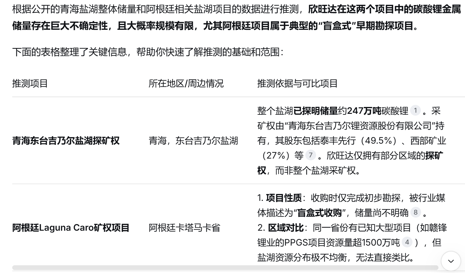 欣旺达有青海吉乃尔盐湖247万吨和阿根廷Laguna Caro盐湖1500万吨锂资源量(以附近赣锋锂业的PPGS项目资源量超1500万吨推测)合计1800万吨