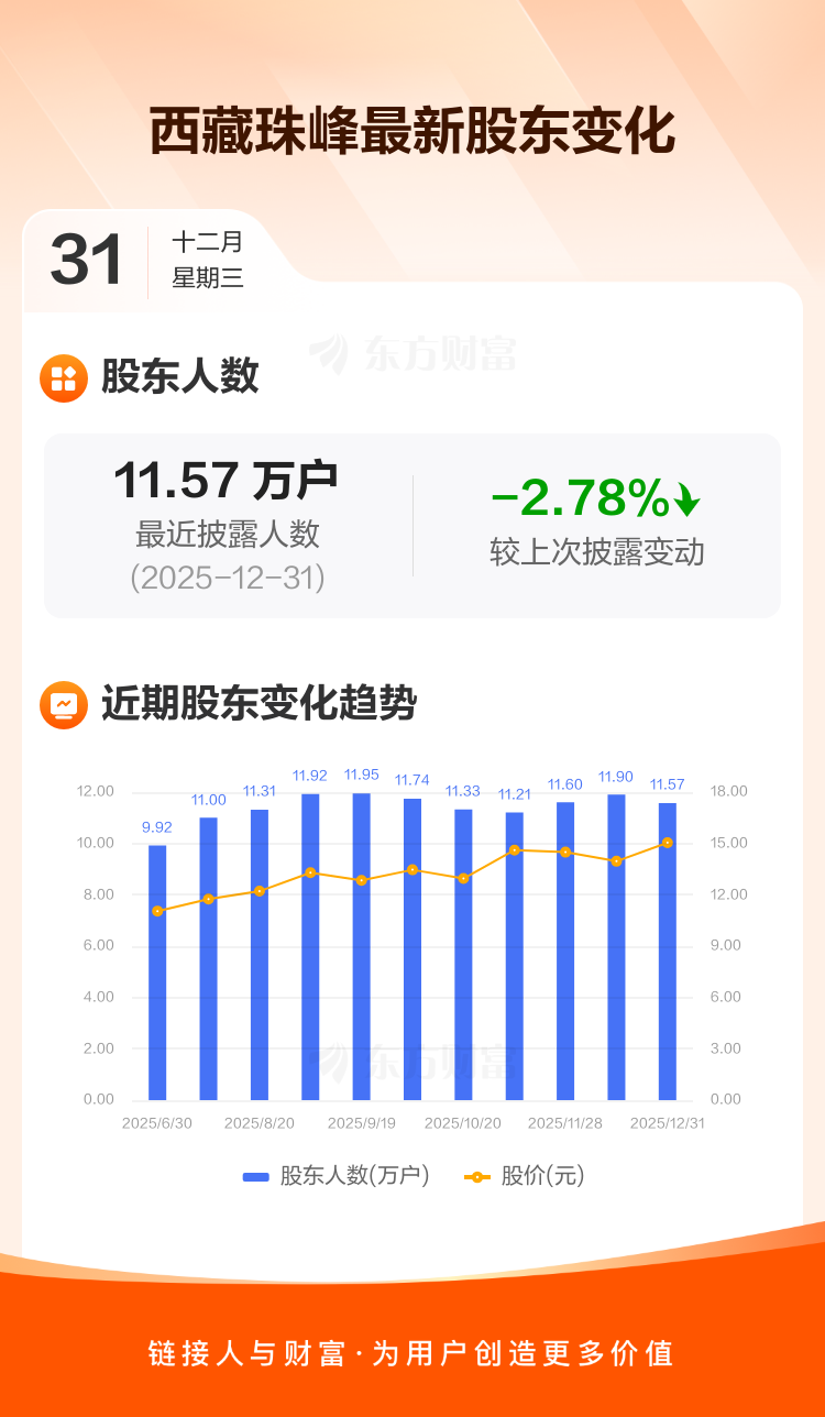 西藏珠峰:截至12月31日最新股东户数11.57万户,较上期减少2.78%