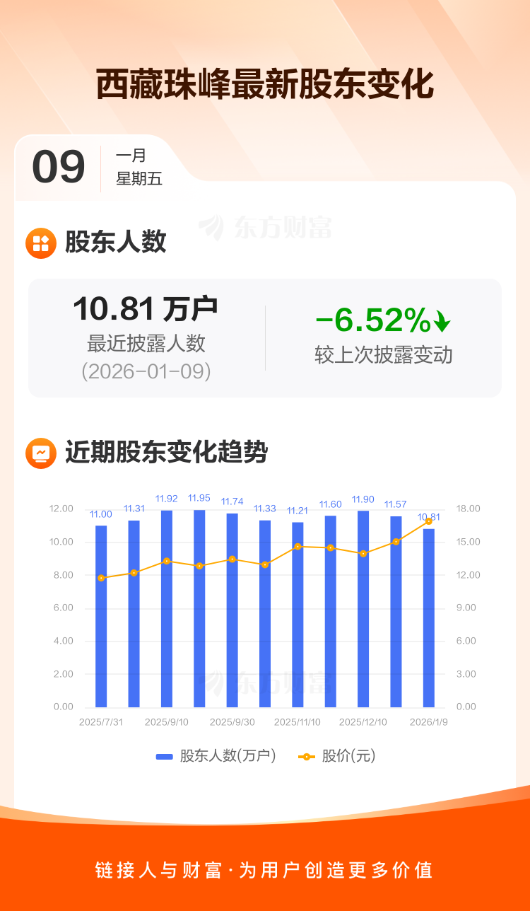 西藏珠峰:截至1月9日最新股东户数10.81万户,较上期减少6.52%