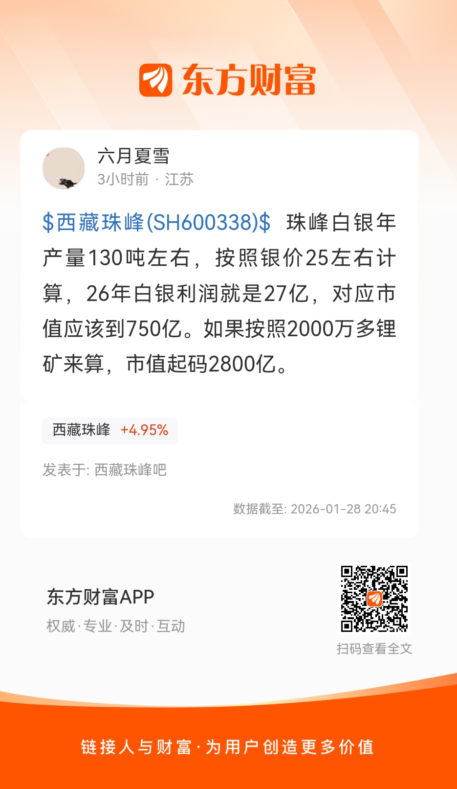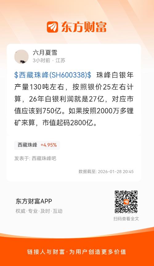 $西藏珠峰(SH600338)$ 珠峰白银年产量130吨左右,按照银价25左右计算,26年白银利润就是27亿,对应市值应该到750亿。如果按照2000万多锂矿来算,市值起码2800亿。