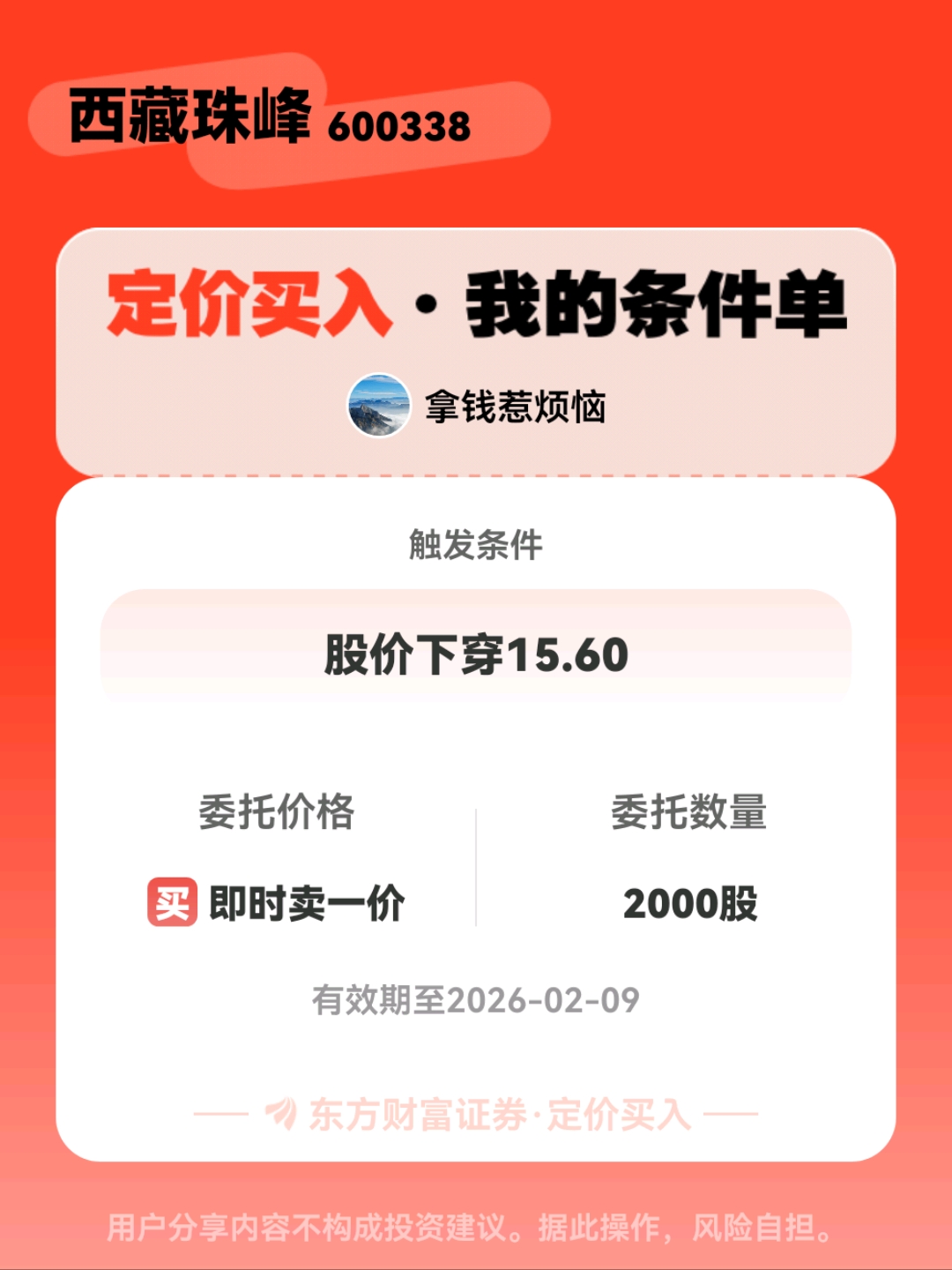 #条件单交流# #定价买入晒单# 一位股神设置了一个定价买入条件单,接下来就是见证奇迹的时刻~$西藏珠峰(SH600338)$