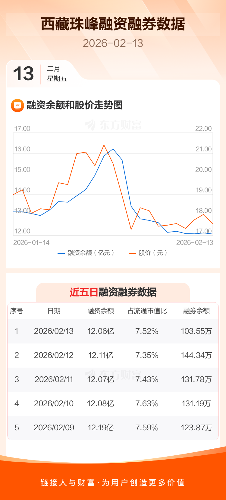 交易所最新数据显示,西藏珠峰于2026年2月13日获融资买入4859.33万元,融资偿还5371.34万元,当日融资净偿还512.01万元。目前,该股融资余额12.06亿,占流通市值比例为7.52%。