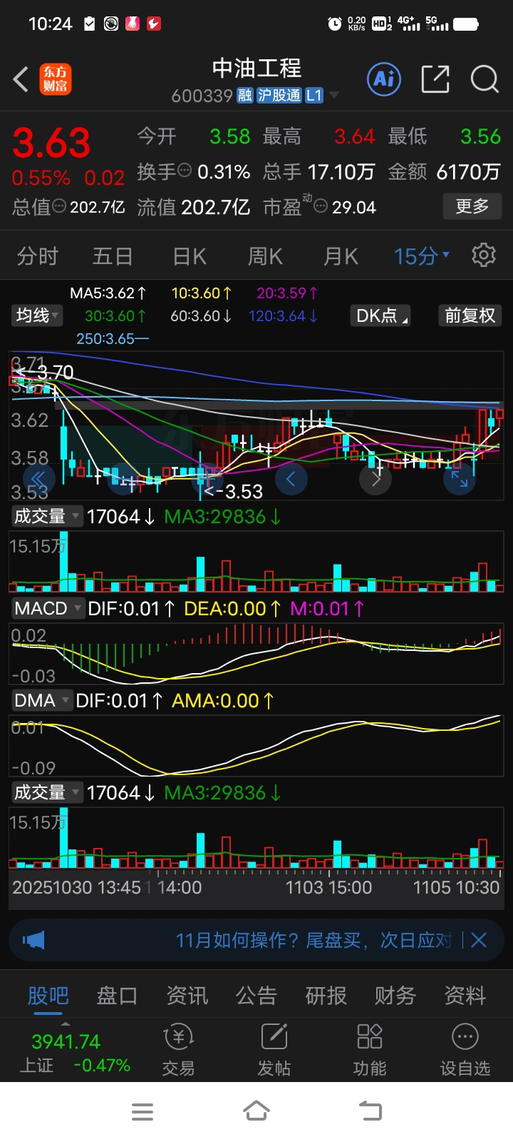 $中油工程(SH600339)$ 15分钟要能站稳250均线就还可以看一下