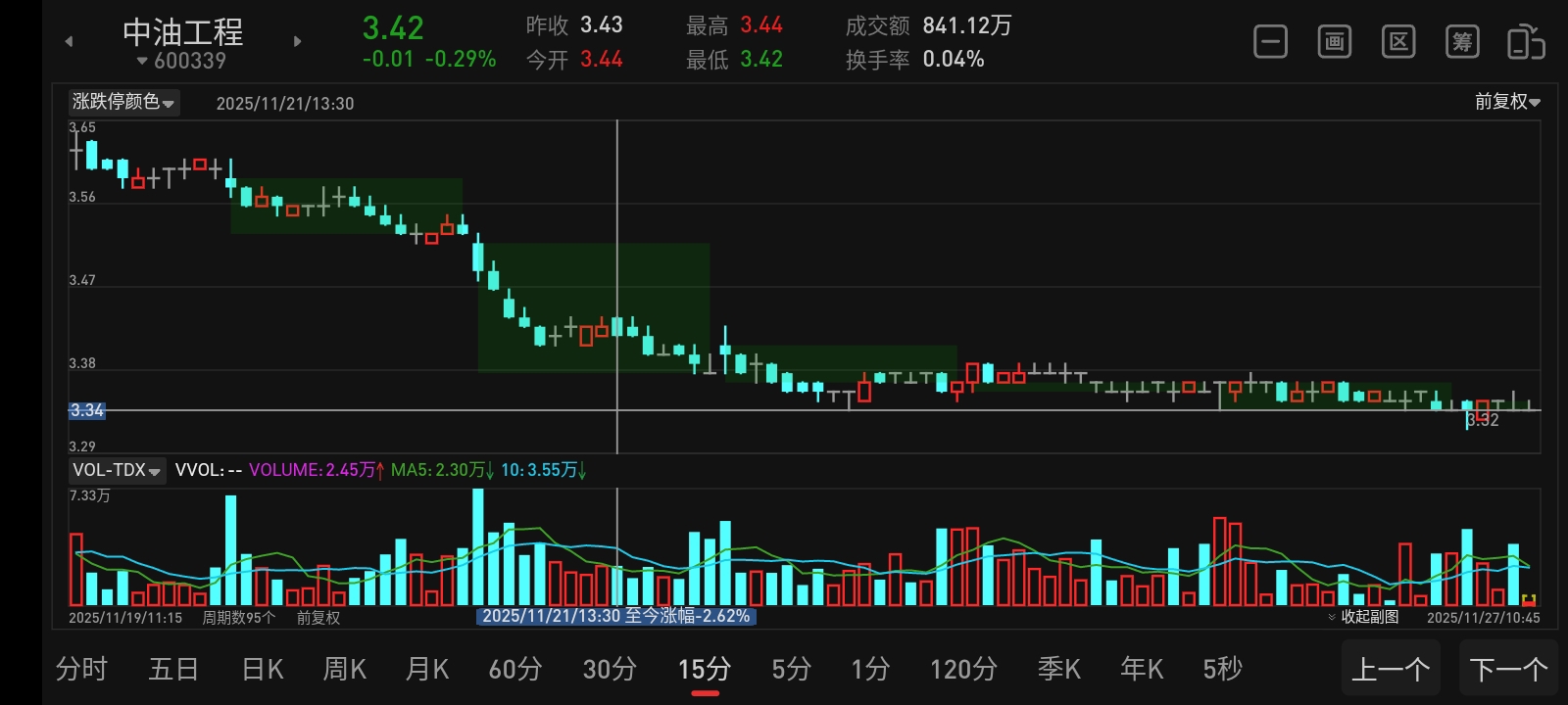 $中油工程(SH600339)$ 指数到3900就会开始砸盘,小心今天冲高大幅回落,这货从15分钟级别看主力行为,这几天被主力托住了也压住不让股价上,这就是大吸筹和洗盘行为,一定想把散户磨出去。接下来还会继续在3块4下方上下震荡,还要注意主力吸筹后挖坑。维持一成仓,适机增仓减仓,随机应变。
