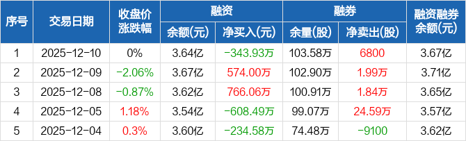 中油工程:融资净偿还343.93万元,融资余额3.64亿元(12-10)