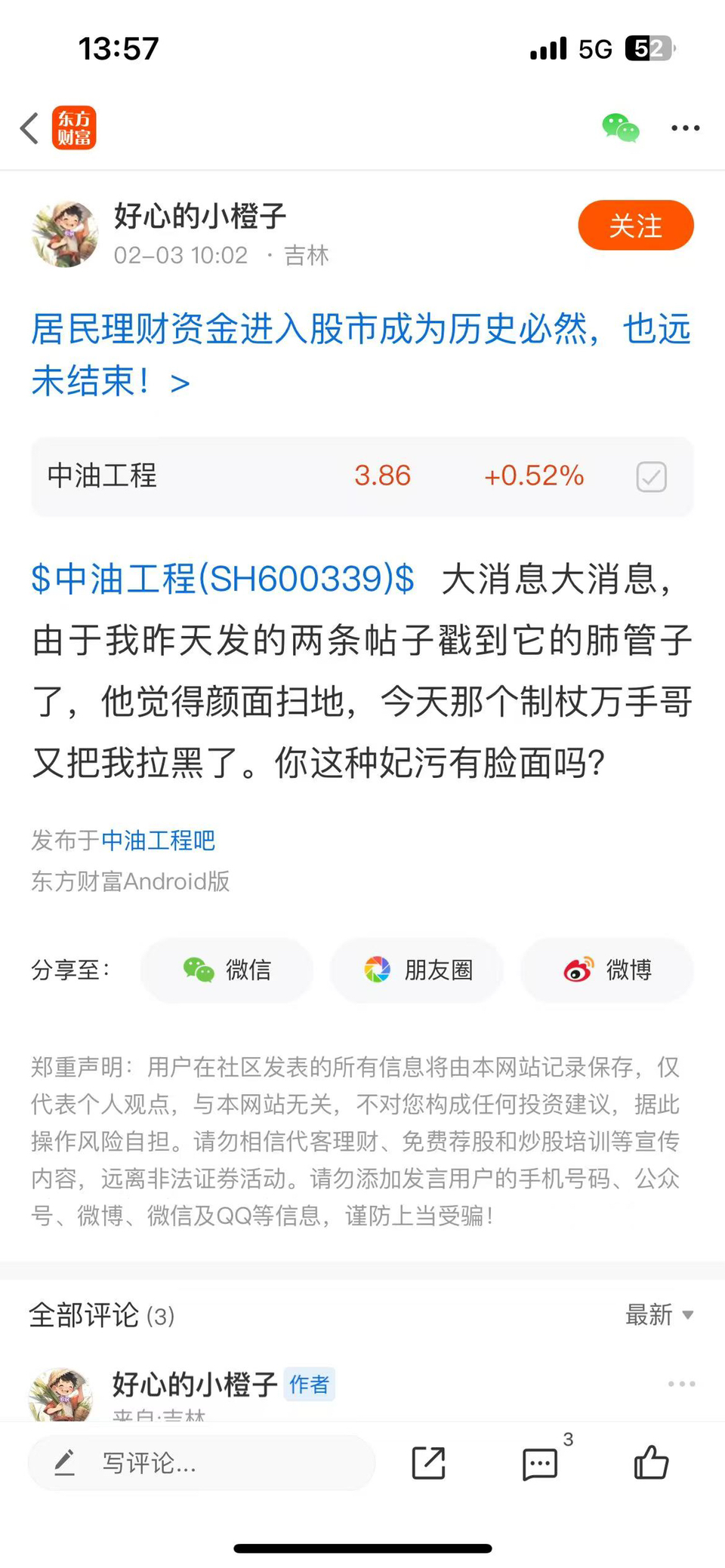 $中油工程(SH600339)$ 傻缺穷鬼一个,搭理你都是给你脸。。