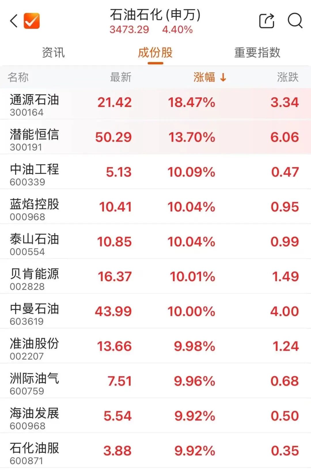 盘面上,石油、天然气、航运等板块涨幅居前。中油工程、泰山石油、贝肯能源、洲际油气、准油股份等多只个股涨停。