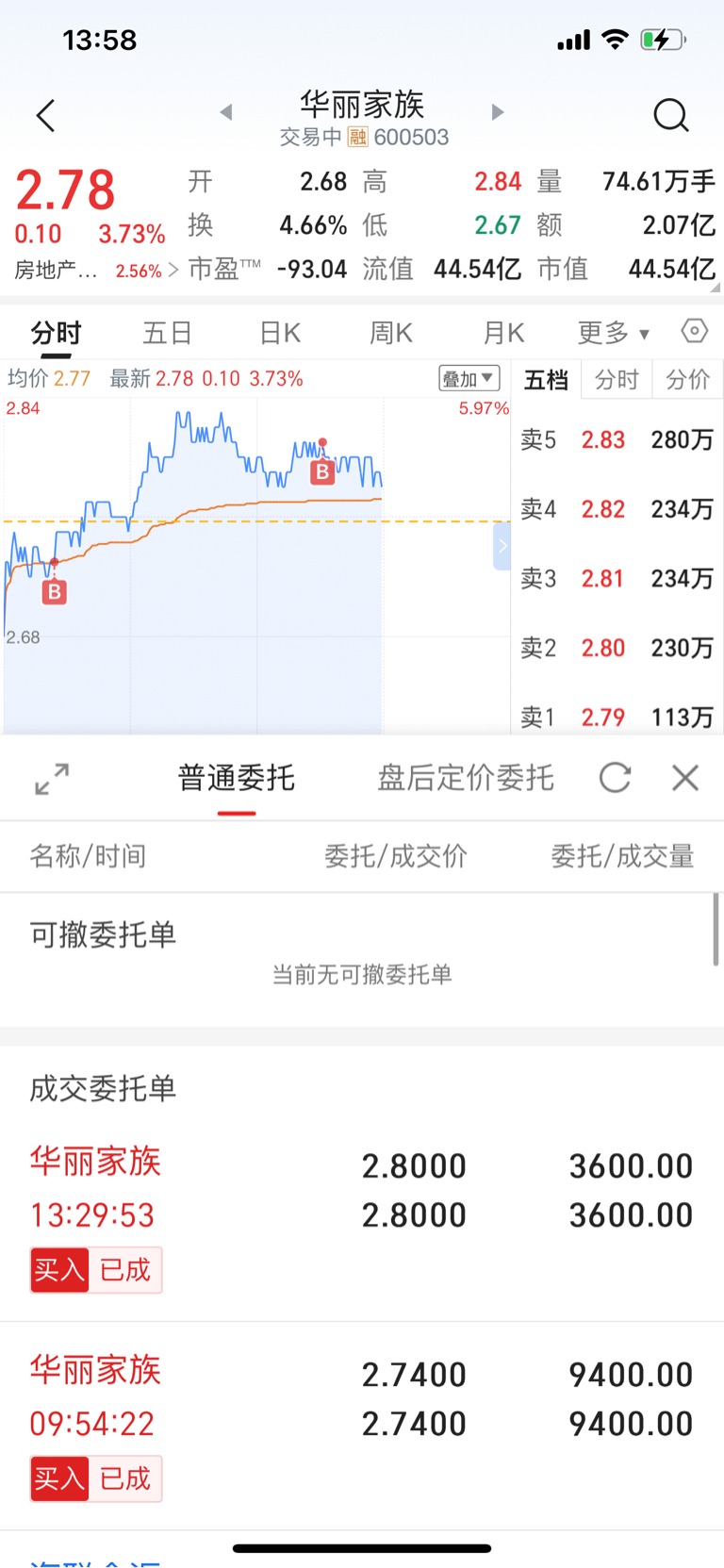 $华夏幸福(SH600340)$ $华远地产(SH600743)$ $华丽家族(SH600503)$ 3.11出华夏幸福2.98没接上直接3.11接回来亏个手续费,1.94挂华远地产没挂上转战华丽家族2.74.2.80总进13000股,华丽家族比较有潜力,今天特意洗2.94筹码峰,明天去留再决定。