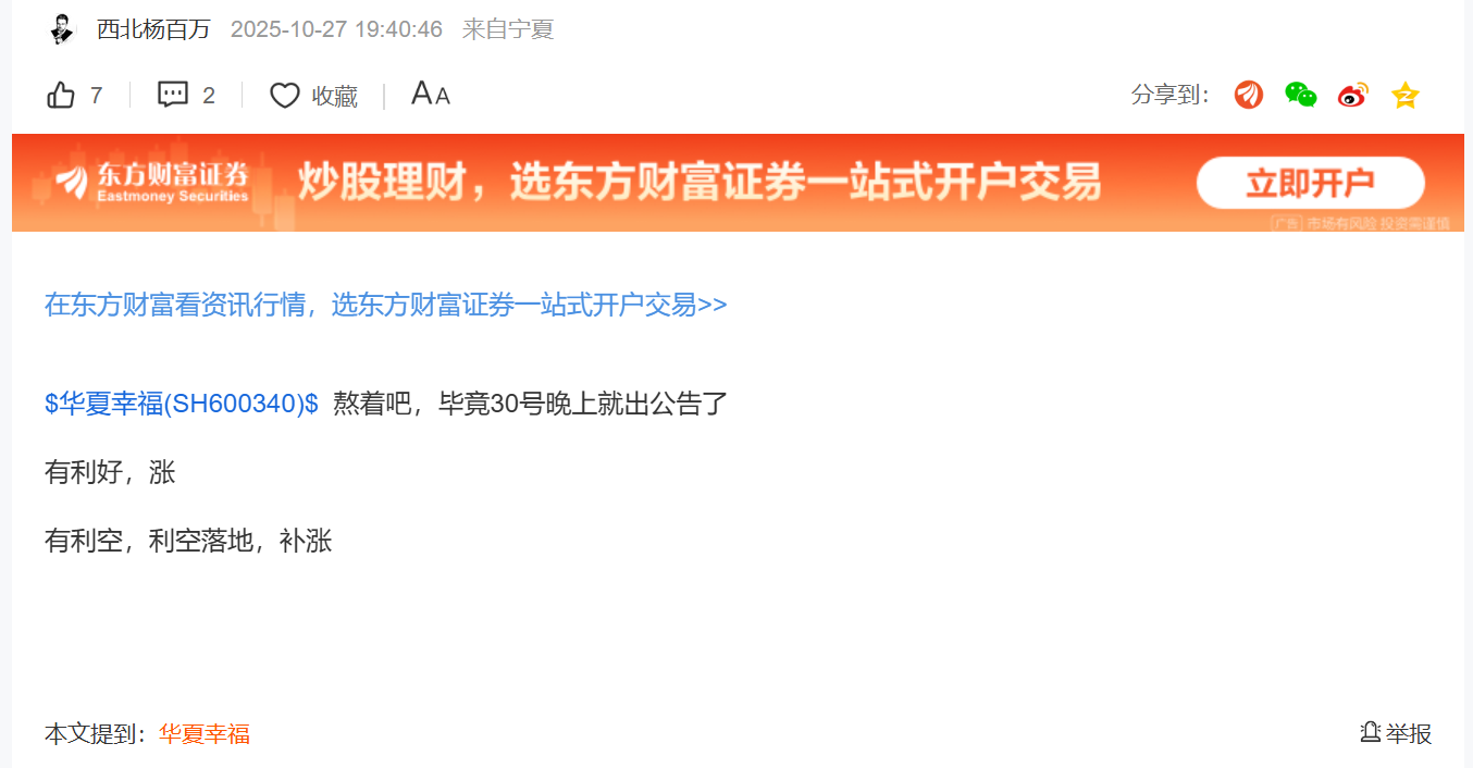现在呢,直接脱掉伪装,说华夏幸福发公告,利空呢是利空出尽会涨,利好呢会补涨。一句话,无论发什么公告都会涨,哈哈哈,哈哈哈,这就是典型的托啊