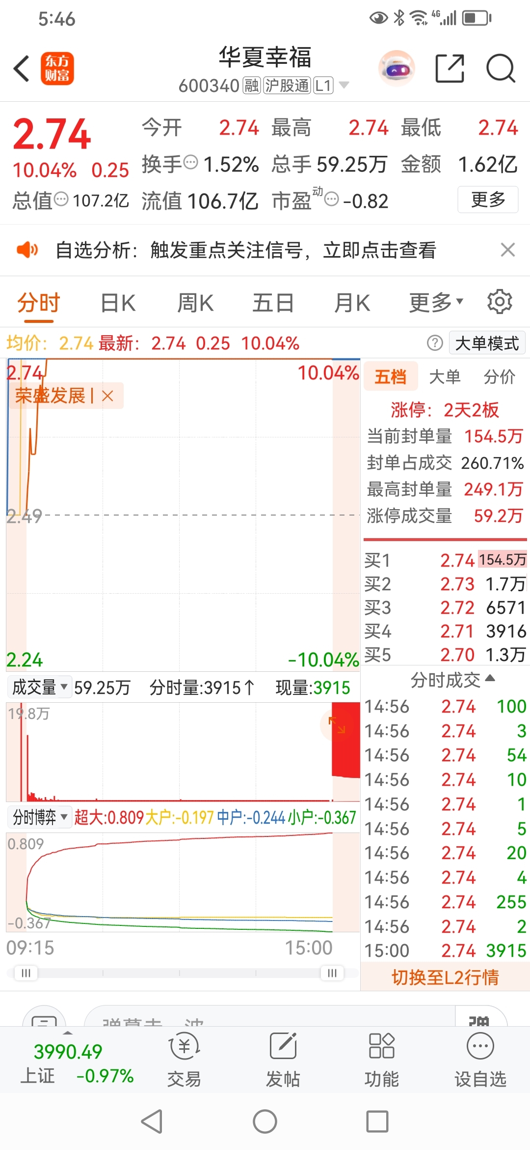 方军:游资观察今天市场,制定操盘股票华夏幸福,严格 准确 控制半仓