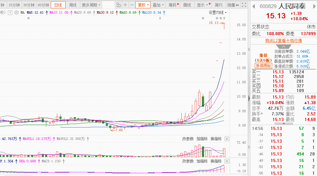 人民同泰:连板妖王之一,前期是一字板,上周五从一字板换成T字板,目前是5连板,在当前妖股热门以及连板情绪火热下,估计同泰也会转变成换手板继续冲锋,从封单2个亿K资J拉升力度还是比较强的,可以考虑周一竞价早盘涨幅不大先手。