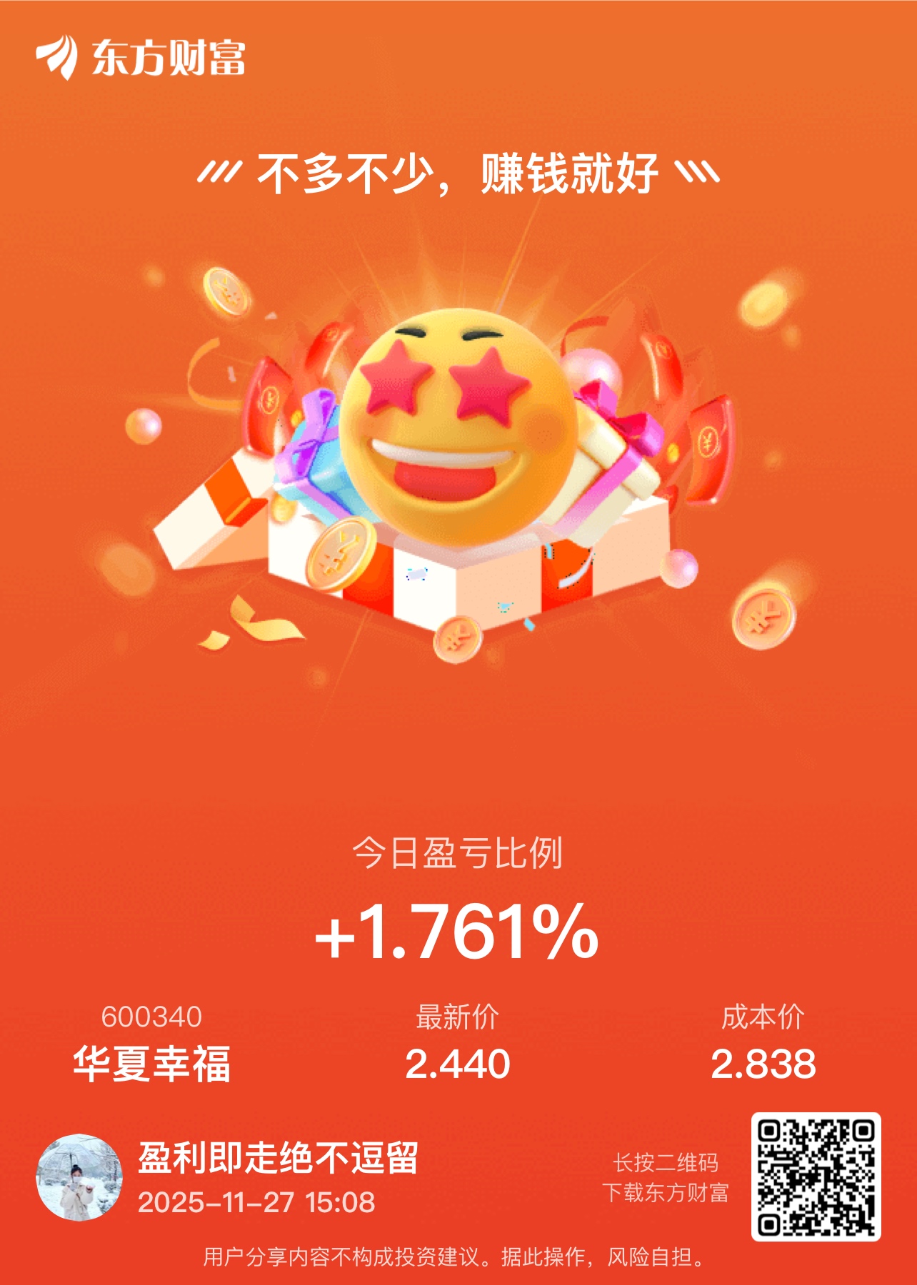 $华夏幸福(SH600340)$ 明早低开可以继续买一波 拉低成本 涨上去后继续做T 减少损失#收盘点评# #炒股日记# #复盘记录# #强势机会# #实盘记录#