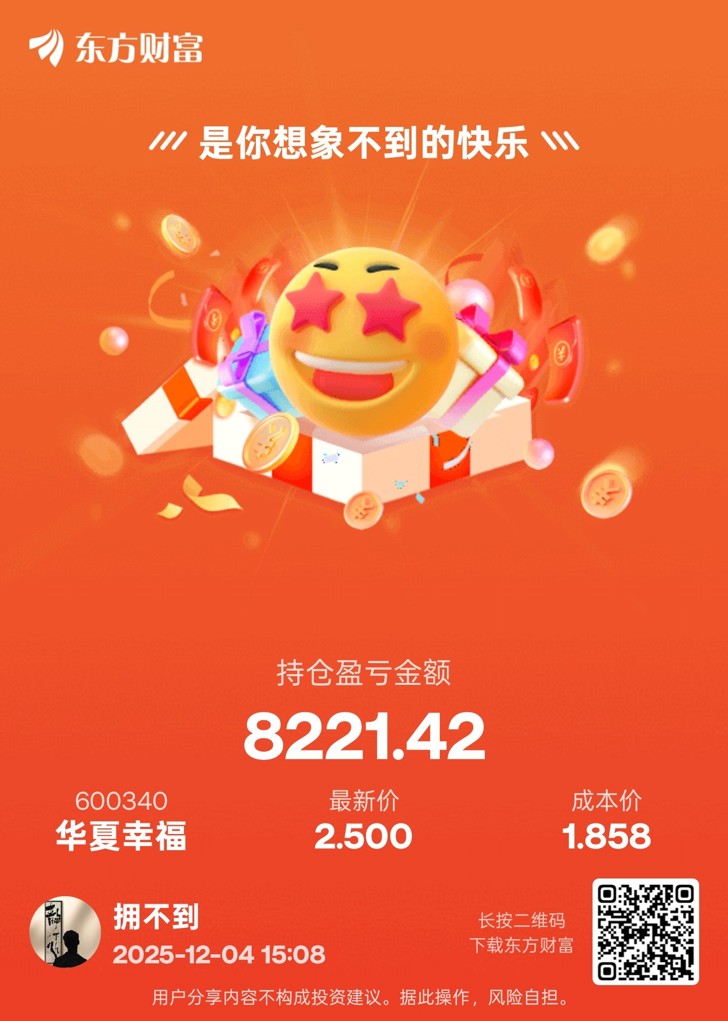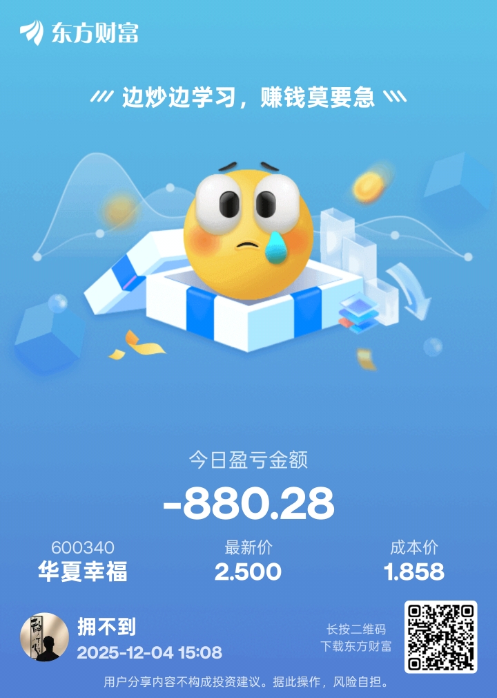 $华夏幸福(SH600340)$ 昨天跑了又买回来一点早上设置2.78想清仓的结果没卖到亏了880.28大洋,下午气不过2.50加仓了唉