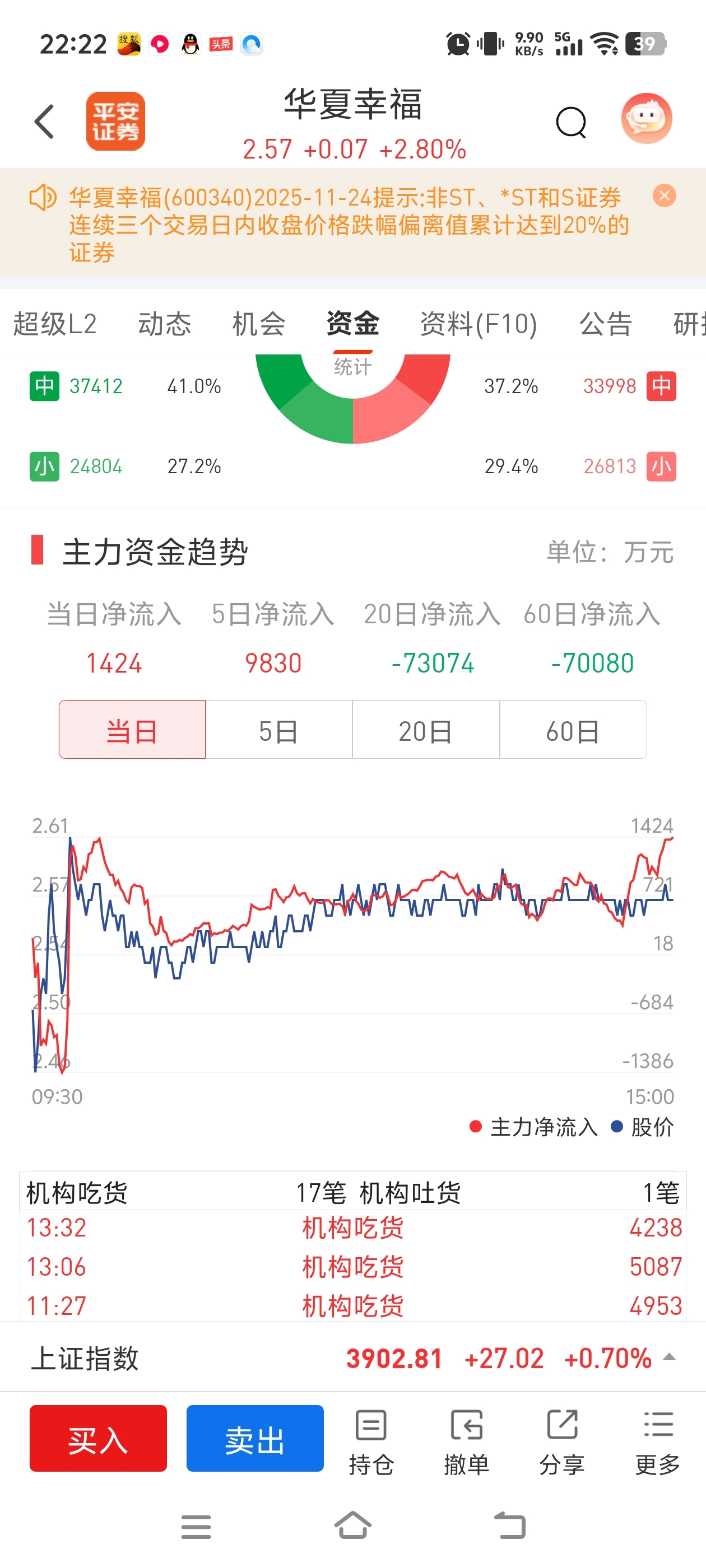 $华夏幸福(SH600340)$ 机构吃了17笔才吐了一笔,代表主力资金的红线高高向上,还怕个毛,法院时间是4号出的,那天跌了6个点,5号主力又来了说明什么