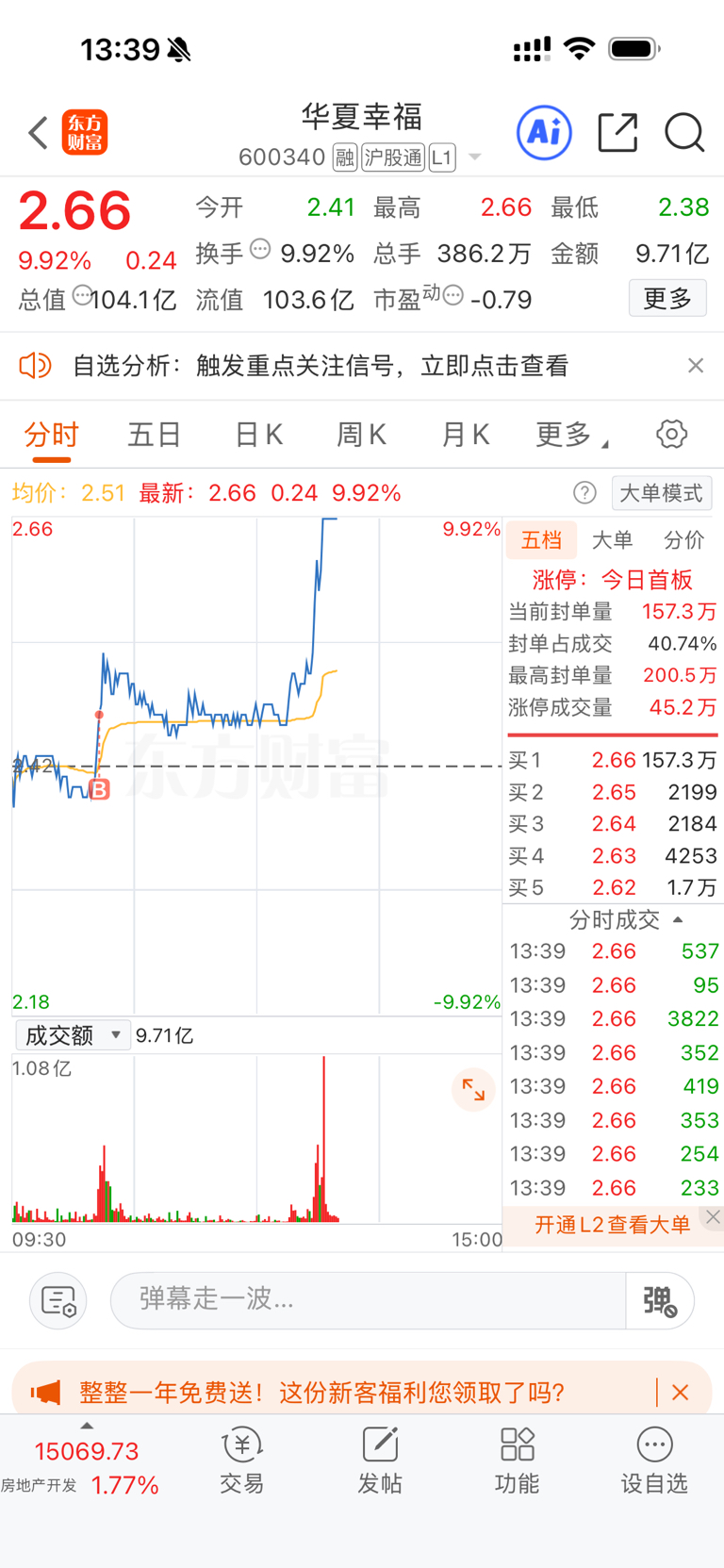 $华夏幸福(SH600340)$ 2.48买入,下午涨停