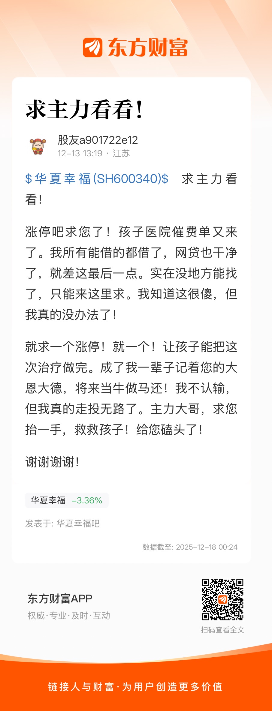 就求一个涨停!就一个!让孩子能把这次治疗做完。成了我一辈子记着您的大恩大德,将来当牛做马还!我不认输,但我真的走投无路了。主力大哥,求您抬一手,救救孩子!给您磕头了!
