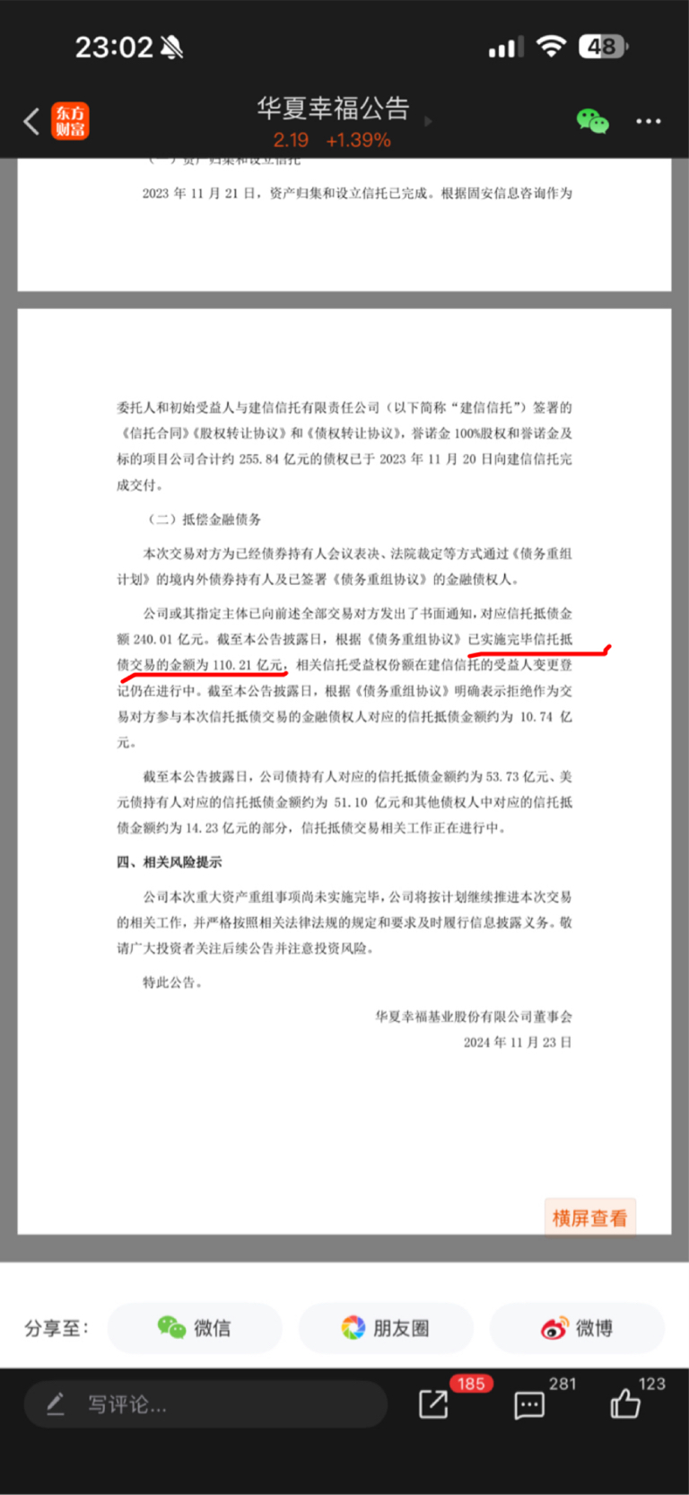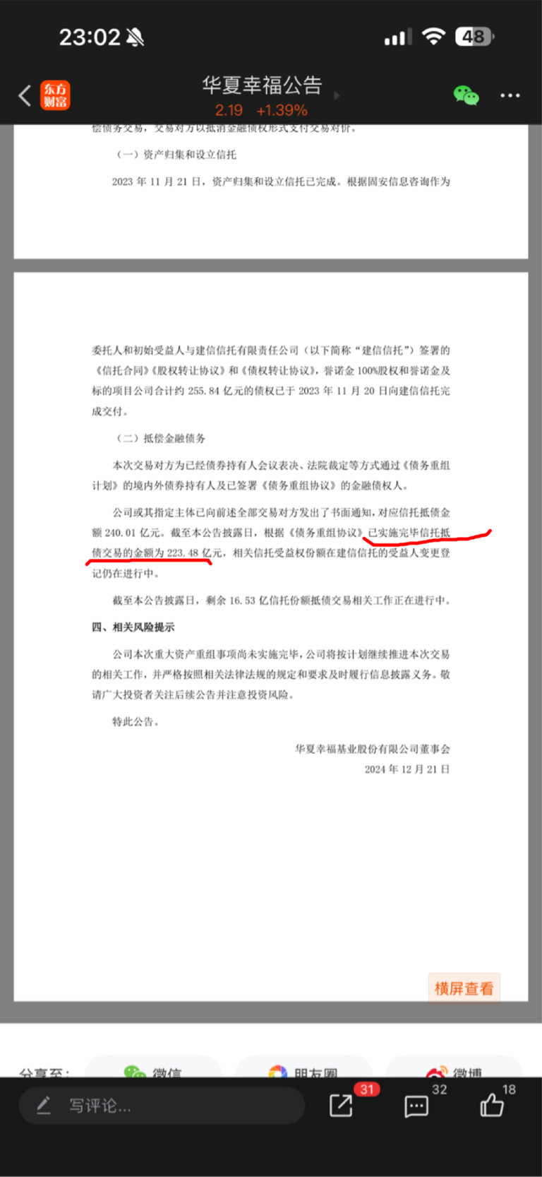 $华夏幸福(SH600340)$ 从2024年11月23日的110.21亿,到2024年12月21日的223.48亿,一个月间变化挺大。但是又经历了1年,时至今日,仍然还是223.48亿执行完成,没啥进展……