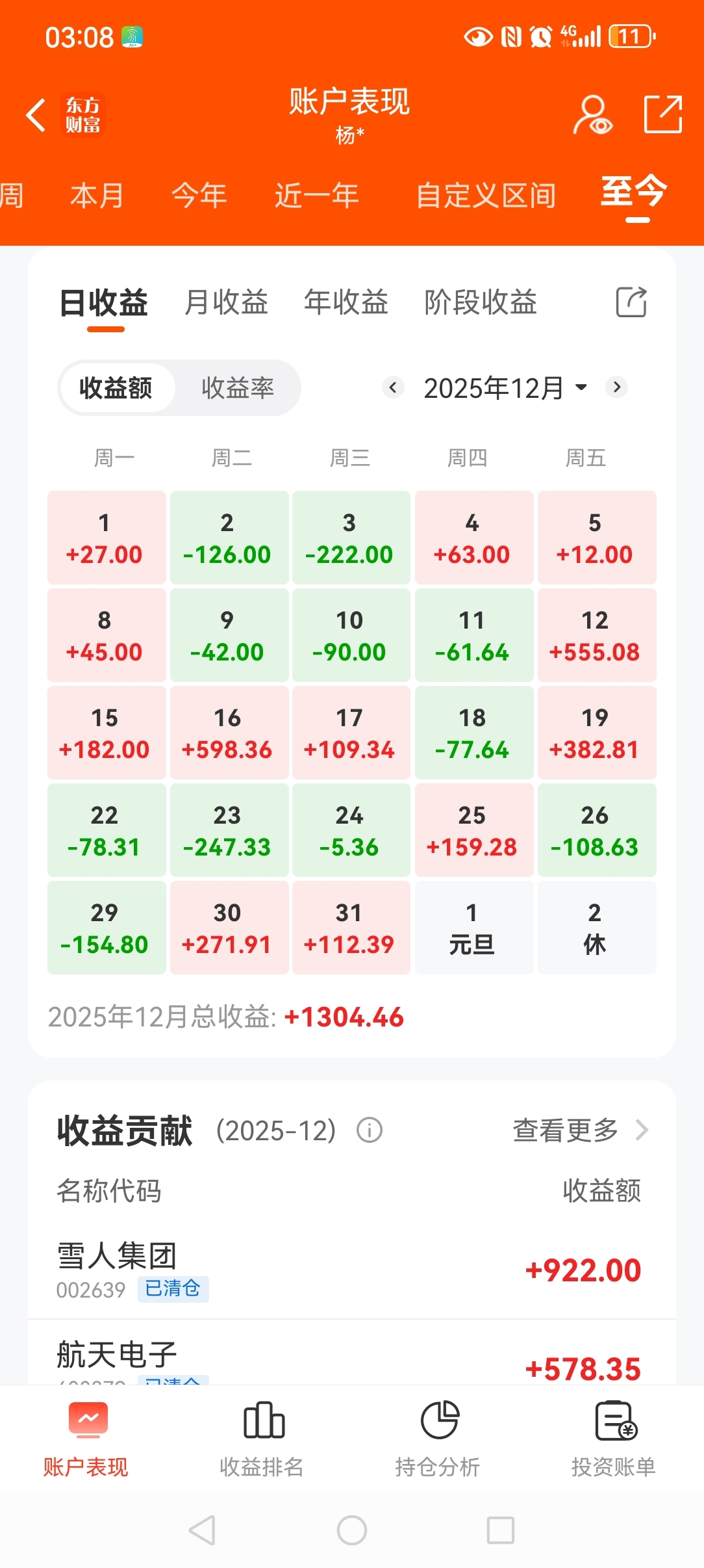 每年的12月份,都是负,今年终于正了,希望来年加油,争取2026年回本