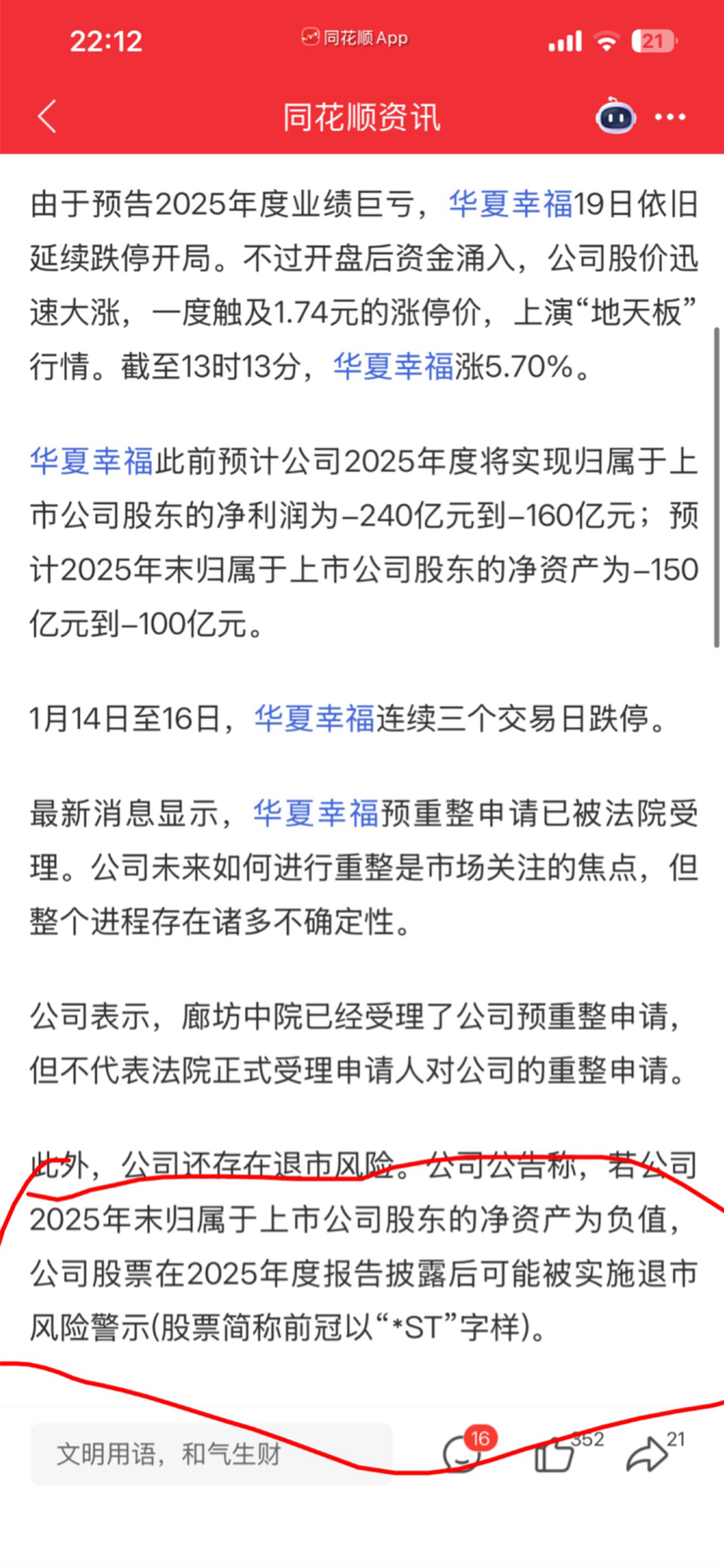 $华夏幸福(SH600340)$ 一个个不懂退市新规,一直在引导恐慌退市,同花训里都写得明明白白,带星ST而已,它还没资格退市,在说大股东里有平安