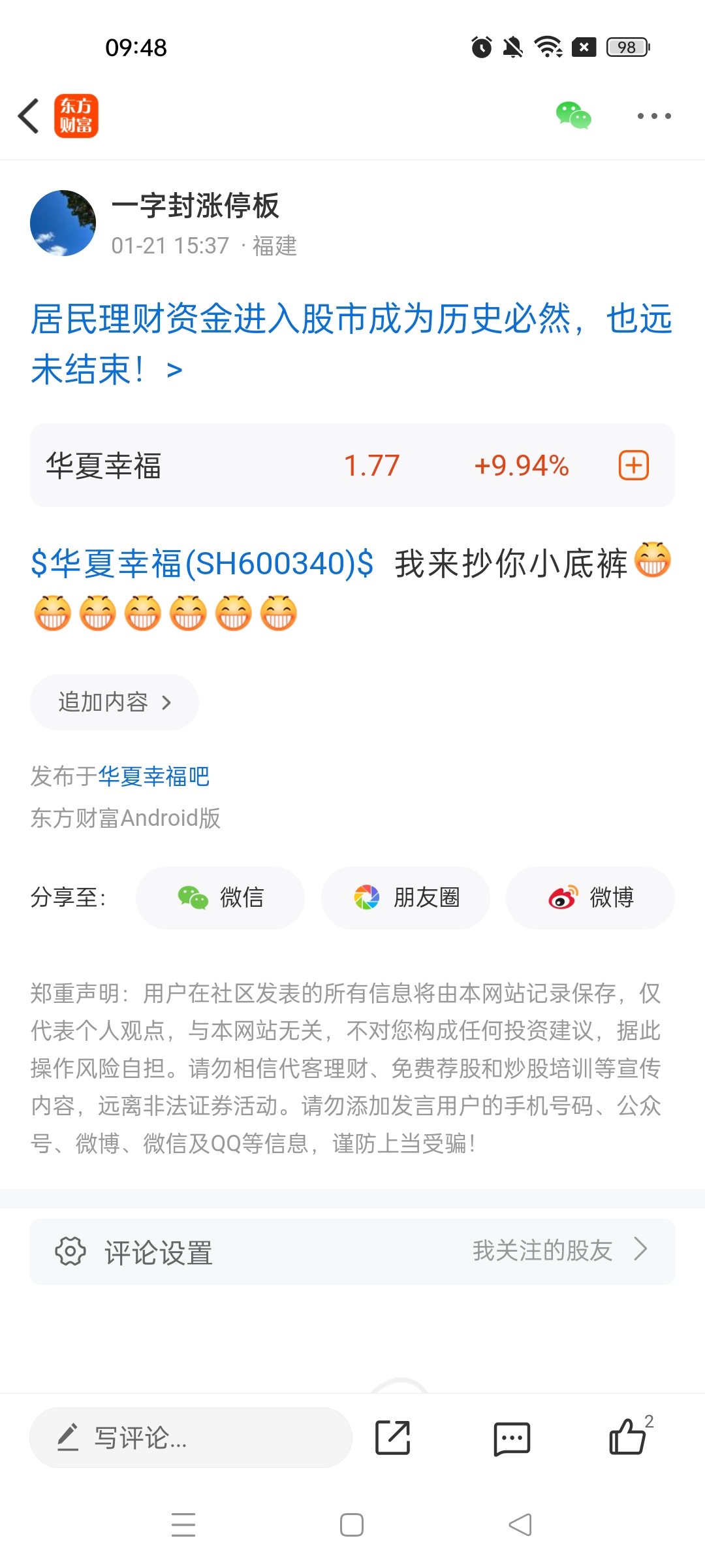 温馨提示: 1.根据《证券法》规定,禁止编造、传播虚假信息或者误导性信息,扰乱证券市场;2.用户在本社区发表的所有资料、言论等仅代表个人观点,与本网站立场无关,不对您构成任何投资建议。用户应基于自己的独立判断,自行决定证券投资并承担相应风险。《东方财富社区管理规定》