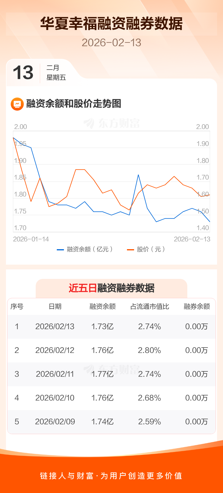 交易所最新数据显示,华夏幸福于2026年2月13日获融资买入74.04万元,融资偿还350.94万元,当日融资净偿还276.9万元。目前,该股融资余额1.73亿,占流通市值比例为2.74%。