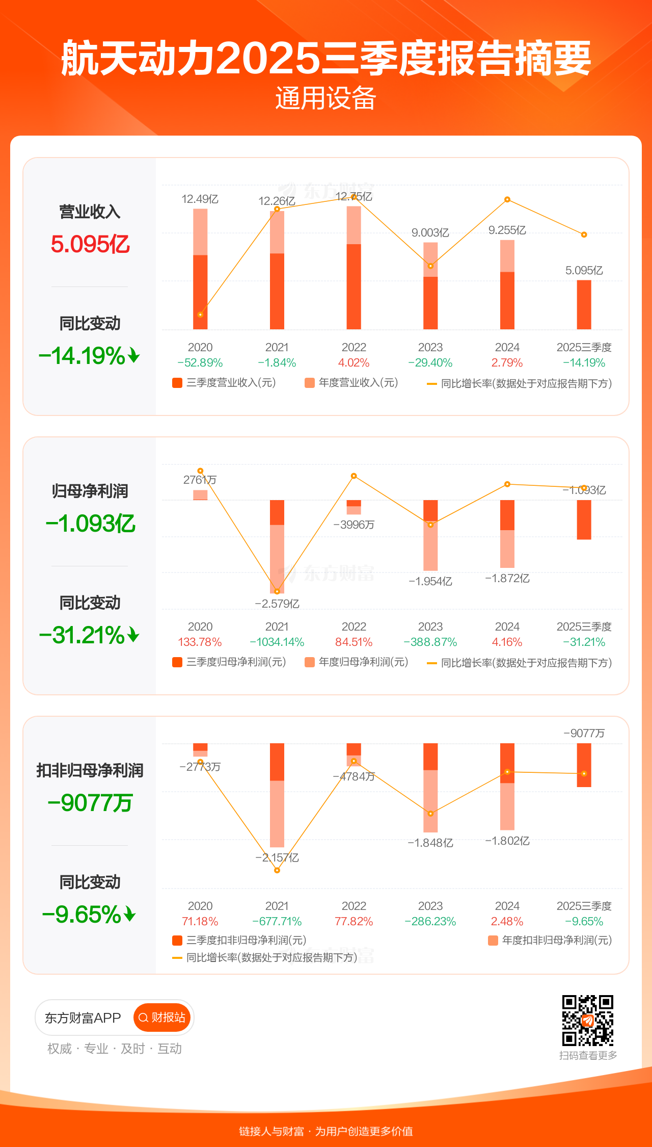 航天动力10月31日发布2025年三季报显示,公司前三季实现营业收入5.10亿元,同比下滑14.19%;归母净利润-1.09亿元;扣非归母净利润-9077.46万元。