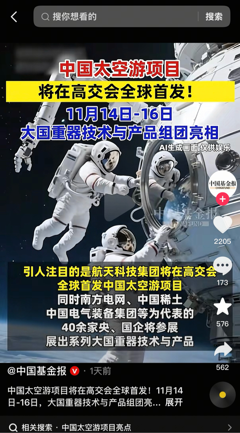 $航天动力(SH600343)$ 航天科技集团太空游项目下周高交会发布