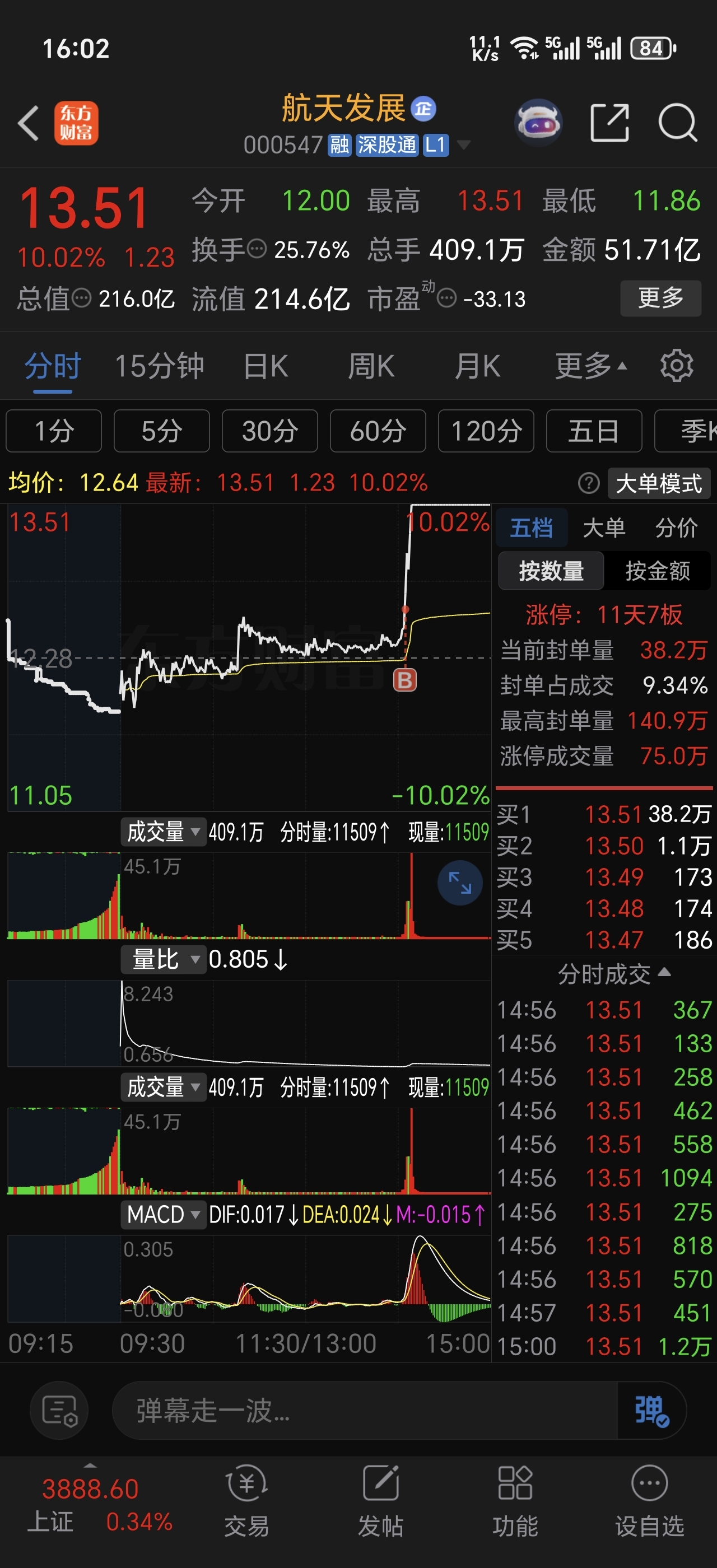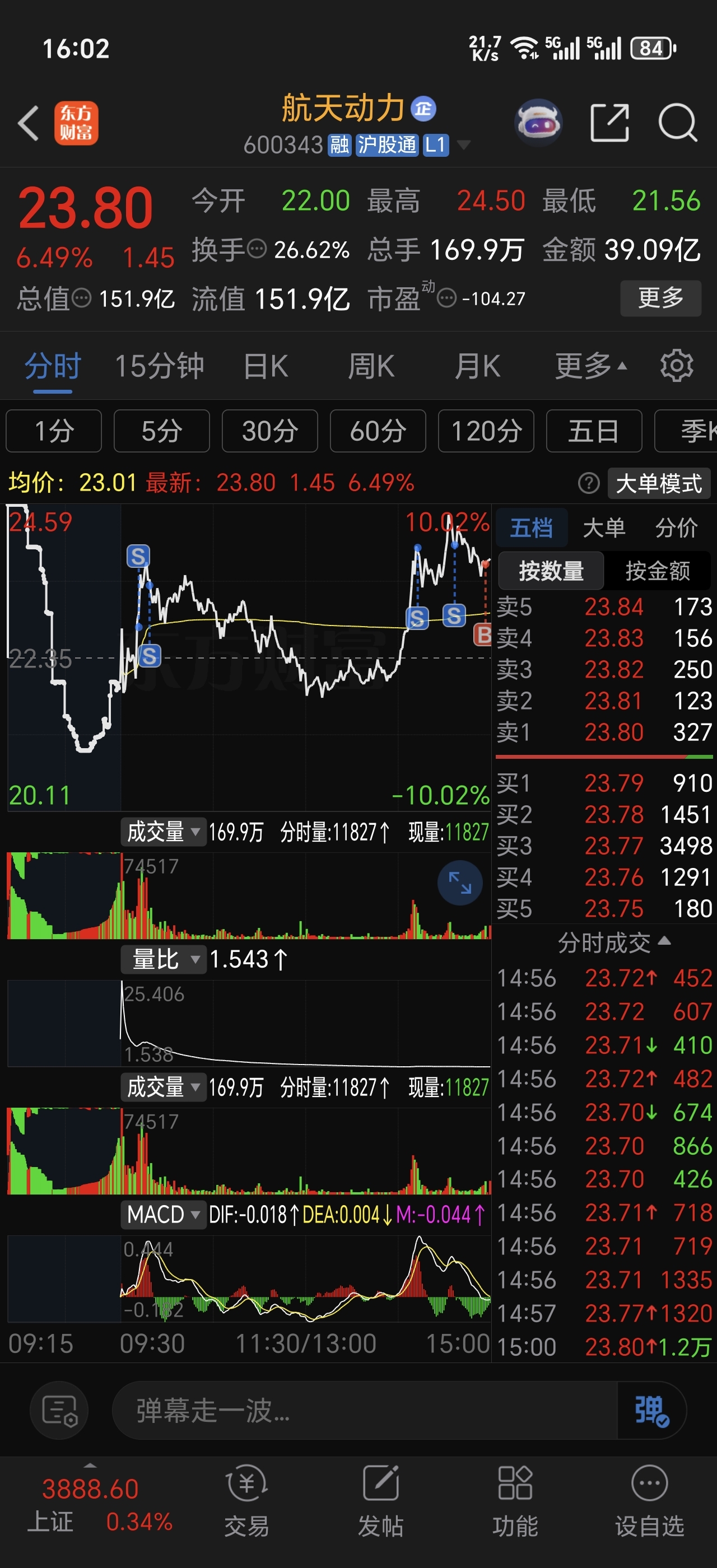 $航天动力(SH600343)$ 没封板,但一点不弱,要是真封板了反而更可能是诱多出货了,看全天走势,更像是诱空洗盘,虽然快速拉升肯定会进来很多散户,但新进的散户并不会增加后期拉升的抛压,因为收盘在均价线上,最终回落幅度不大,今天这种分时更多是清洗不坚定筹码,有少部分盈利以及已经亏损内心浮躁的散户,尤其是前天打板进来的,这种走势很容易被洗出去。我自己本是清仓了,盘中还通过条件单自动买进了航天发展,赚了6个多点,因为考虑它有福建板块加持。但最后思考后也接回了航天动力,觉得它周一上涨概率也不低。