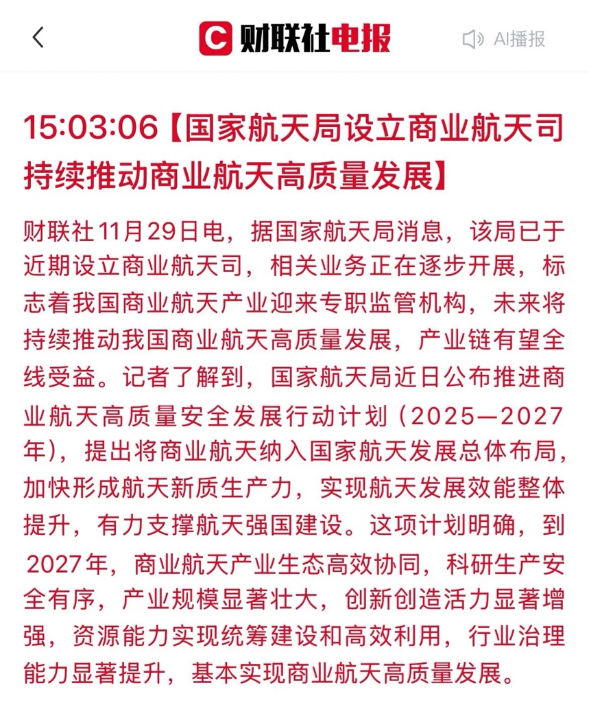 近日,国家航天局宣布正式设立商业航天司,并同步发布《推进商业航天高质量安全发展行动计划(2025—2027年)》,明确将商业航天纳入国家航天发展总体布局。这一系列举措为我国商业航天产业注入强心剂,产业链迎来重大政策利好。