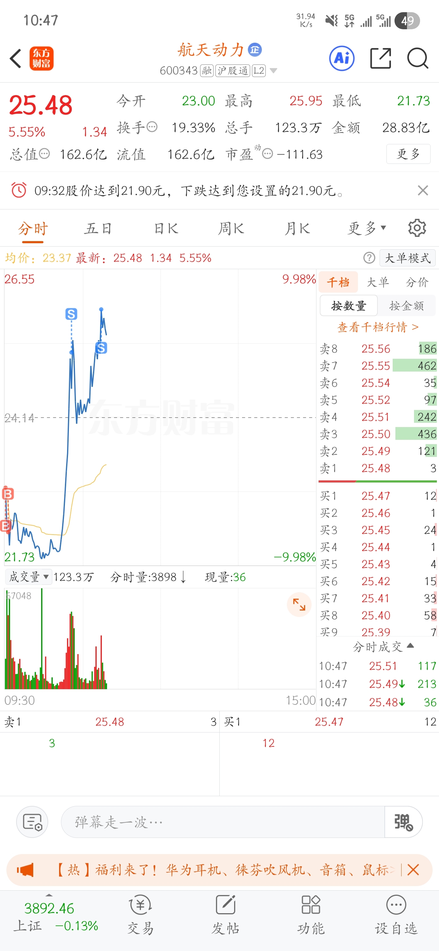 $航天动力(SH600343)$ 谢谢主力!80%了!接下来不动他了