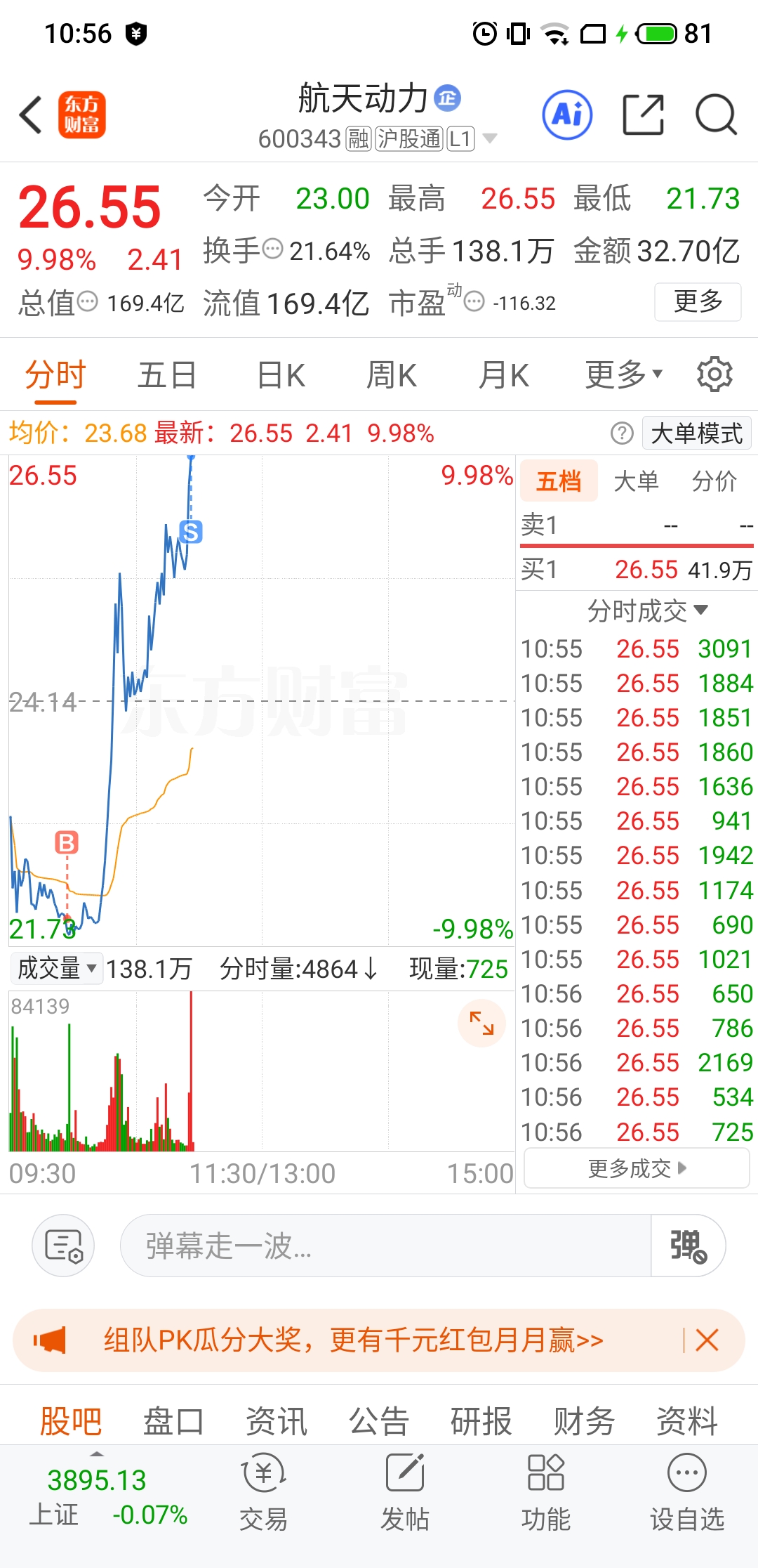 $航天动力(SH600343)$ 知足常乐,先落一半,希望明天不要跳水