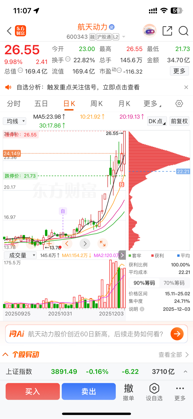 $航天动力(SH600343)$ 昨天满仓干进来,上午触及跌停幸亏格局了一下没割