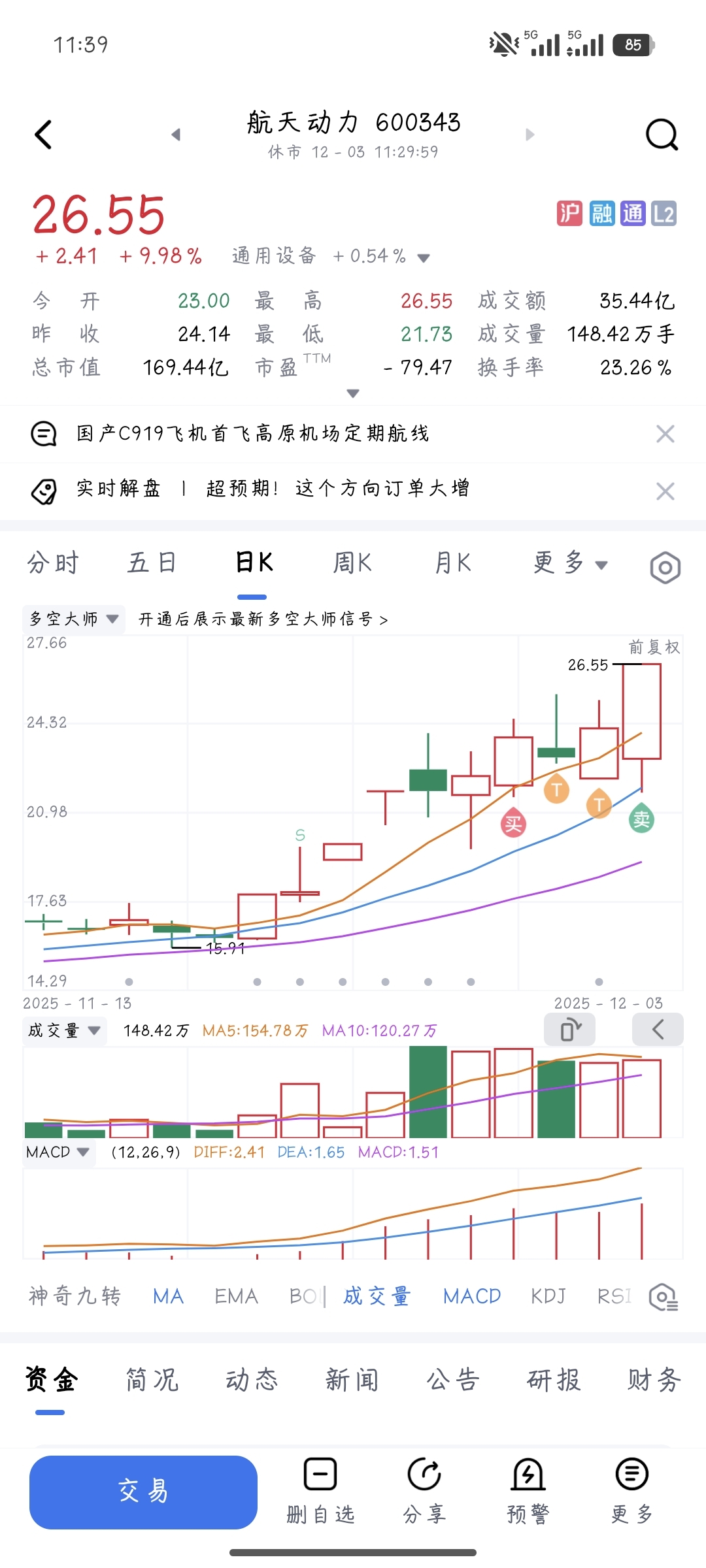 $航天动力(SH600343)$ 昨天把仓位逐步打满,总感觉那么大资金进来应该要搞事,压根没往今天地包天去想,今天-9没钱补仓了!涨停板全部出了!